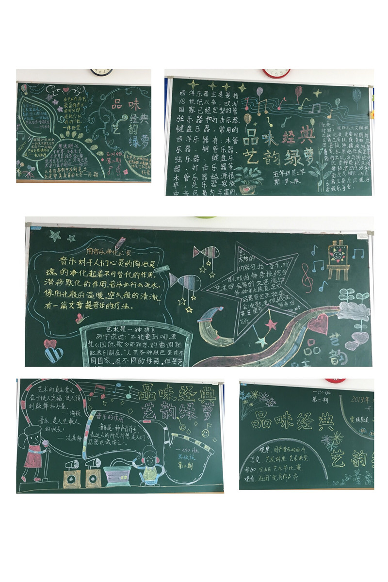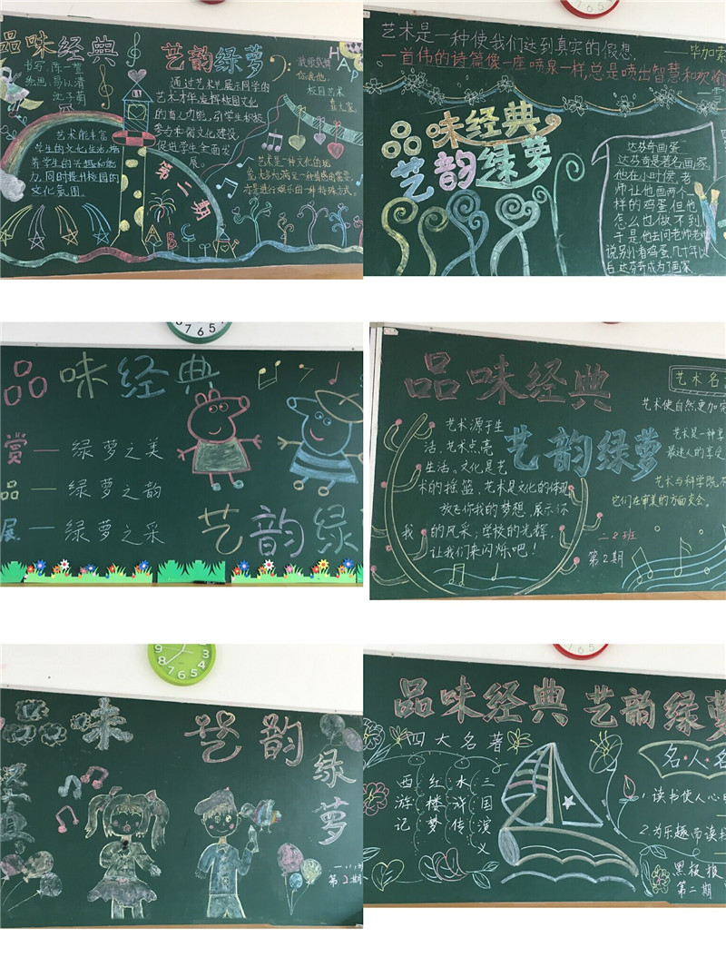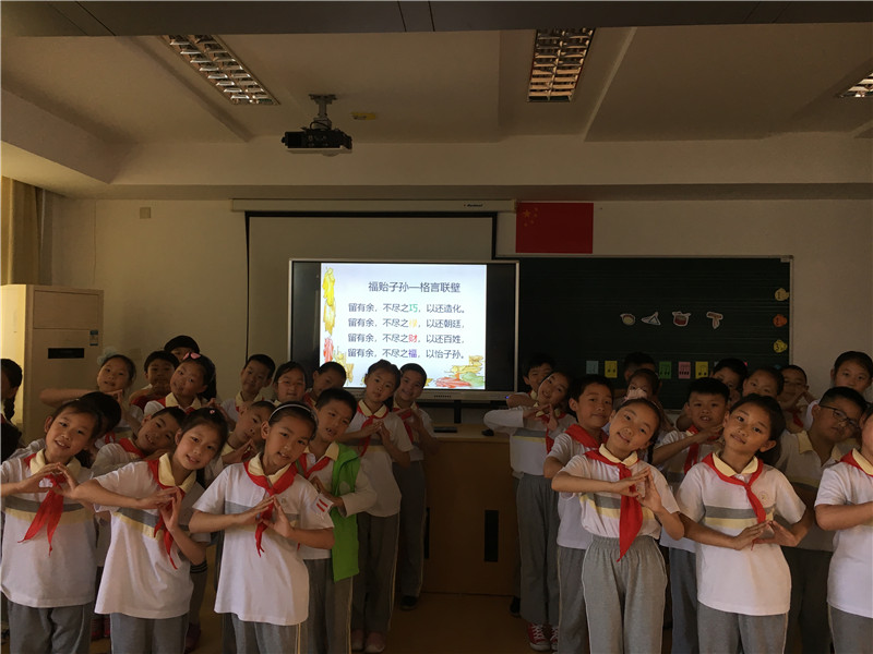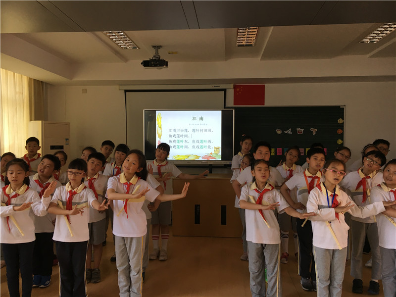 音乐课上学唱经典古诗词,以年级为单位,分别学唱《咏鹅》、《格言联璧》、《江南》、《念奴娇·赤壁怀古》、《明日歌》。歌曲的选择结合校园艺术节的主题 “品味经典”,用歌声弘扬经典,用音乐传承文化。