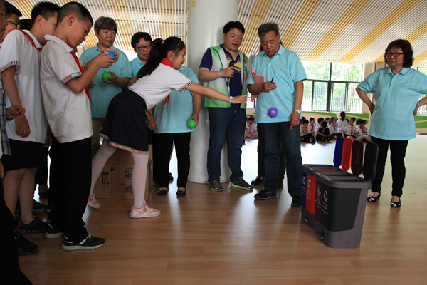 趣味运动会将垃圾分类行动与儿童喜闻乐见的游戏项目有机地整合。第一个游戏:在参赛者前方铺放印有不同分类垃圾标识的塑料板,裁判说出一种垃圾,学生以最快速度挑出自己前方正确的垃圾种类塑料板,就能为班级加一分;第二个游戏:每人发3个海洋球,球上写有垃圾名称,将写有垃圾名称的海洋球扔进前方所属分类正确的塑料桶;第三个游戏:将写有垃圾名称的乒乓球运到标有垃圾分类塑料桶前,正确投入其中;第四个游戏:将代表不同垃圾类别的四色塑料瓶摆成的三角形保龄球阵,开展迷你保龄球赛。