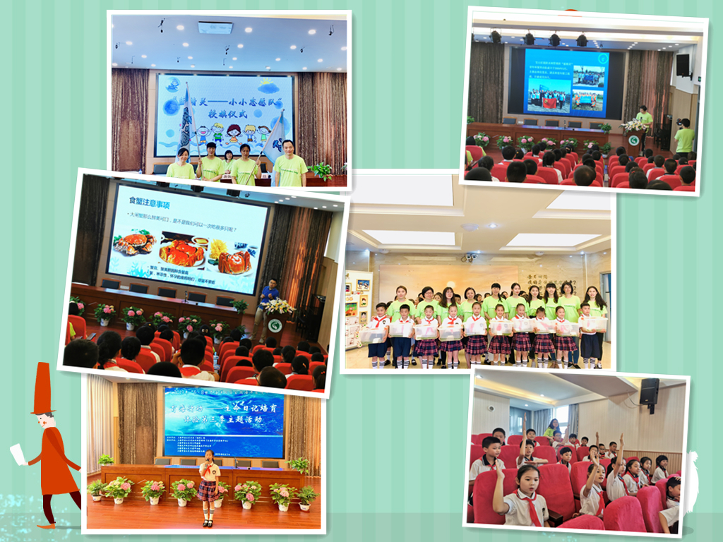 本次活动丰富多彩,环节一:水务局领导和校长致辞,小月芽们接受授旗;环节二:海鸥哥哥介绍蓝精灵环保突击队;环节三:东海水产专家隋延鸣博士对中华绒螯蟹成长进行课程讲座;环节四:学生代表发言,小月芽们领取生命日记体验物资。