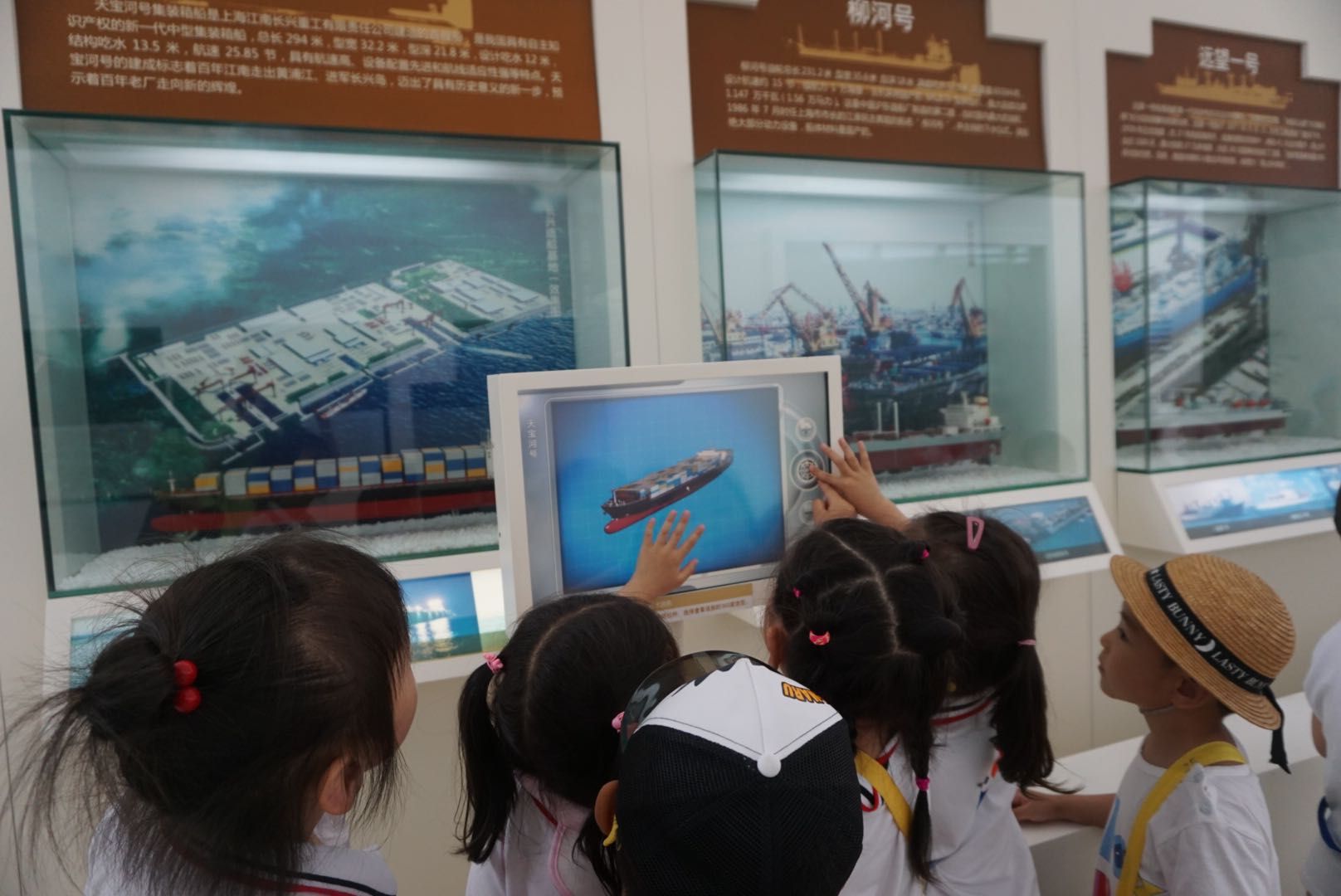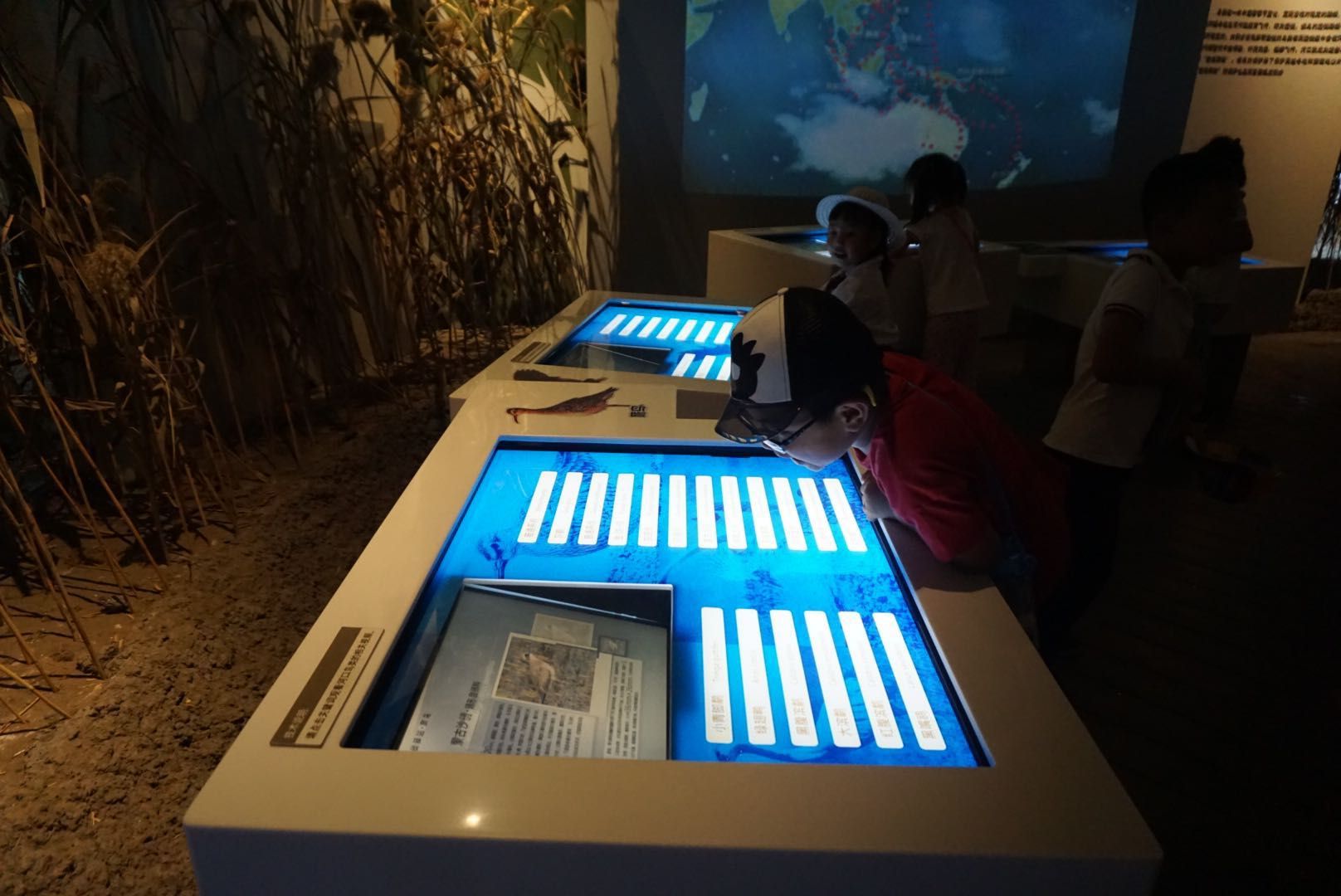 瞧!孩子们走在河口湿地沙盘上,脚下是微缩的实景图,眼前是长江口的船只,真是美妙又有趣!