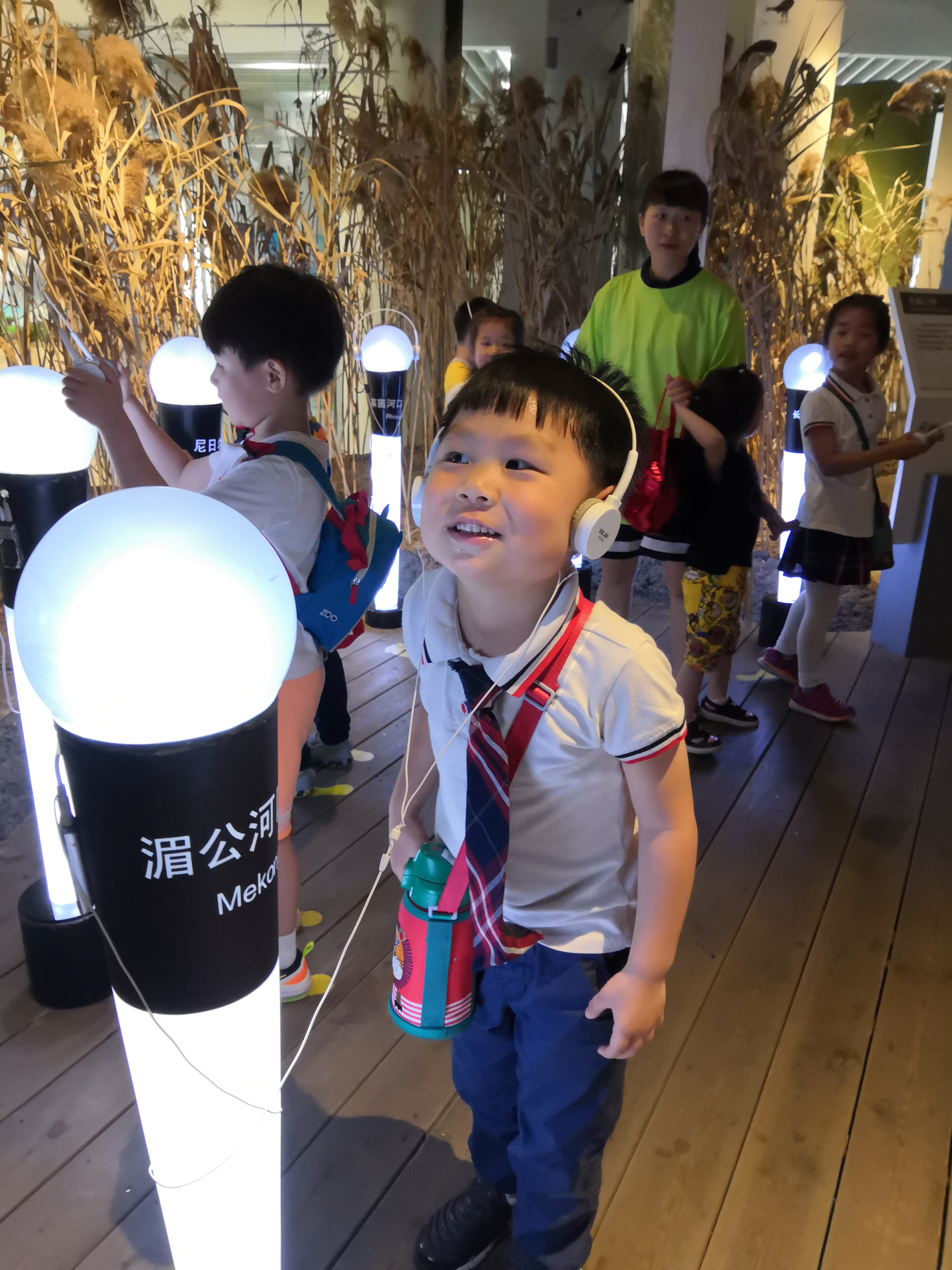 当来到天籁之音区域的时候,孩子们戴着耳机聆听了著名河流入海的水流声,感受到了密西西比河的低沉,黄浦江水的缓慢,长江水的奔腾。