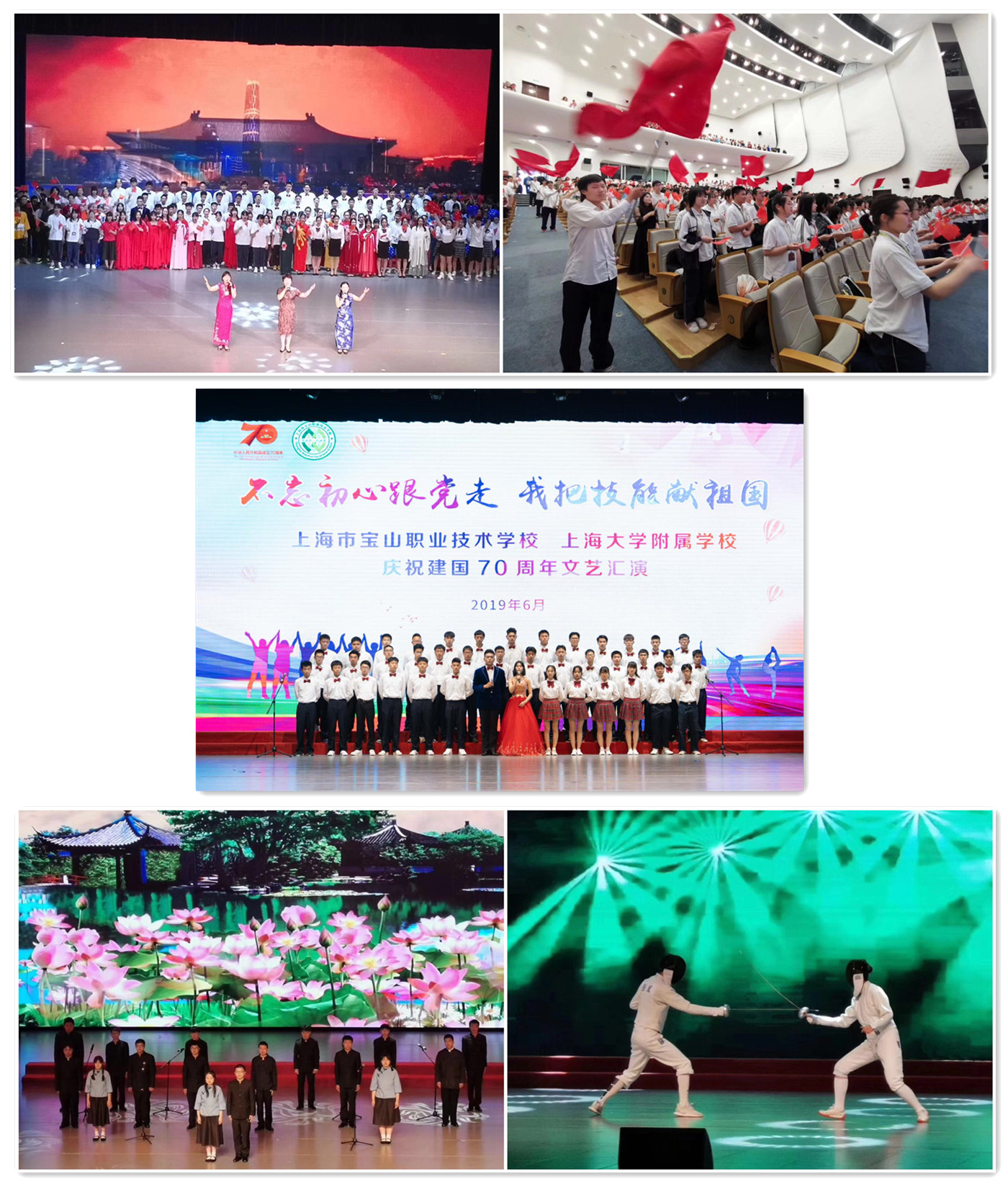 2019年6月11日下午,主题为“不忘初心跟党走,我把技能献祖国”的宝山职校庆祝建国70周年文艺汇演在上海大学剧场隆重举行。广大师生们载歌载舞,尽情抒发对学校、对祖国的热爱之情。此次活动的成功举行不仅丰富了校园文化、也提高了同学们的综合素养。