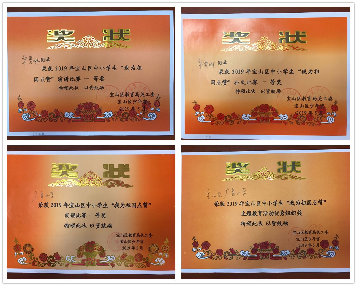 接着,严爱萍老师宣布宝山区中小学生“为祖国点赞”红读系列活动的好消息。广育小学获得“优秀组织奖”;四(7)班解明桥获朗诵比赛一等奖;三(6)班牟曼琳获征文、演讲两项一等奖;三(5)班陈杨裕民、朱希文获征文二等奖。