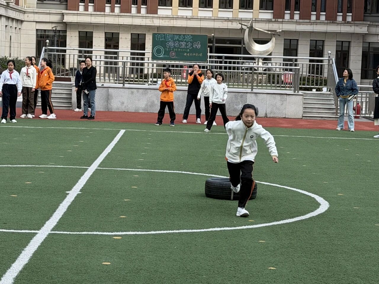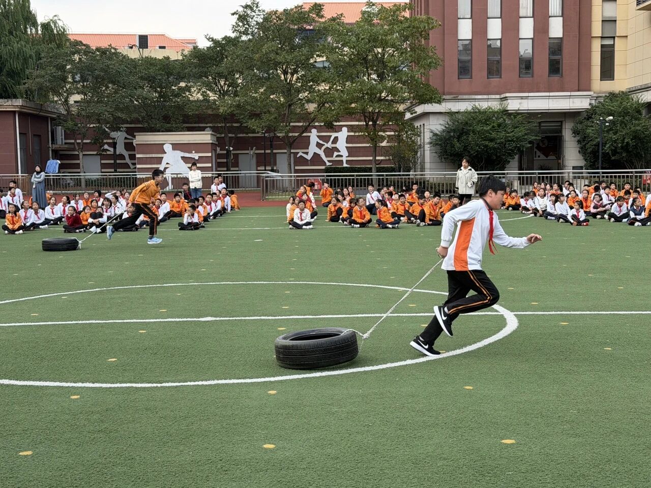 四五年级的趣味轮胎接力赛则尽显力量与默契。赛前,各班选手摩拳擦掌,讨论战术,演练起跑与交接技巧。比赛开始,选手们抓紧绳索、蹬地前行。轮胎摩擦声伴着啦啦队震耳欲聋的呐喊,同学们共同享受运动的快乐。