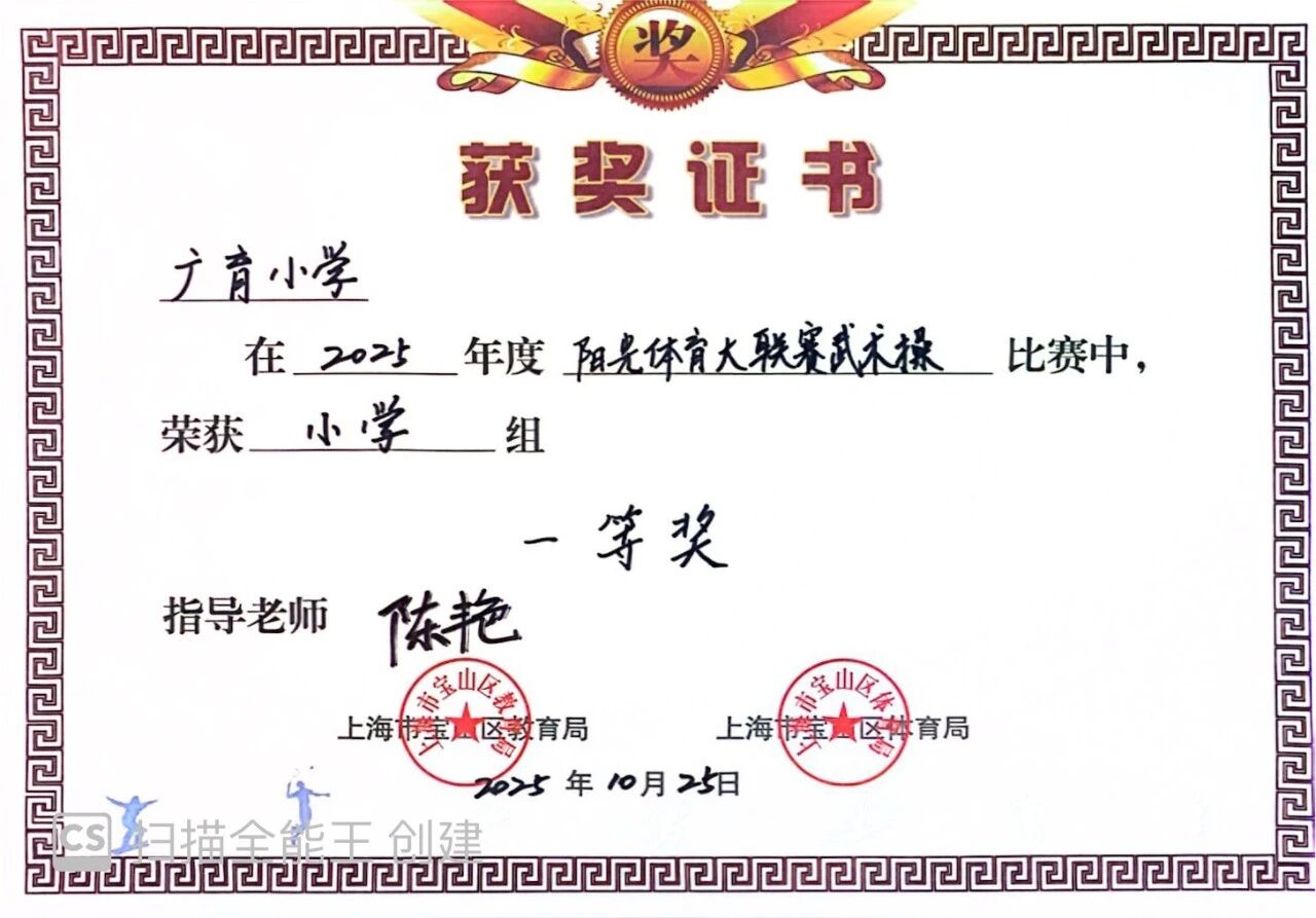 金秋送爽,丹桂飘香。在10月25日隆重举行的2025年度阳光体育大联赛武术比赛中,广育小学的健儿们气势如虹,发挥出色,凭借精湛的武艺和昂扬的斗志,一举夺得集体武术操(小学组)一等奖,并在多个个人比赛中斩金夺银,捷报频传,以辉煌的战绩展现我校阳光体育运动的丰硕成果和学子们蓬勃向上的精神风貌。