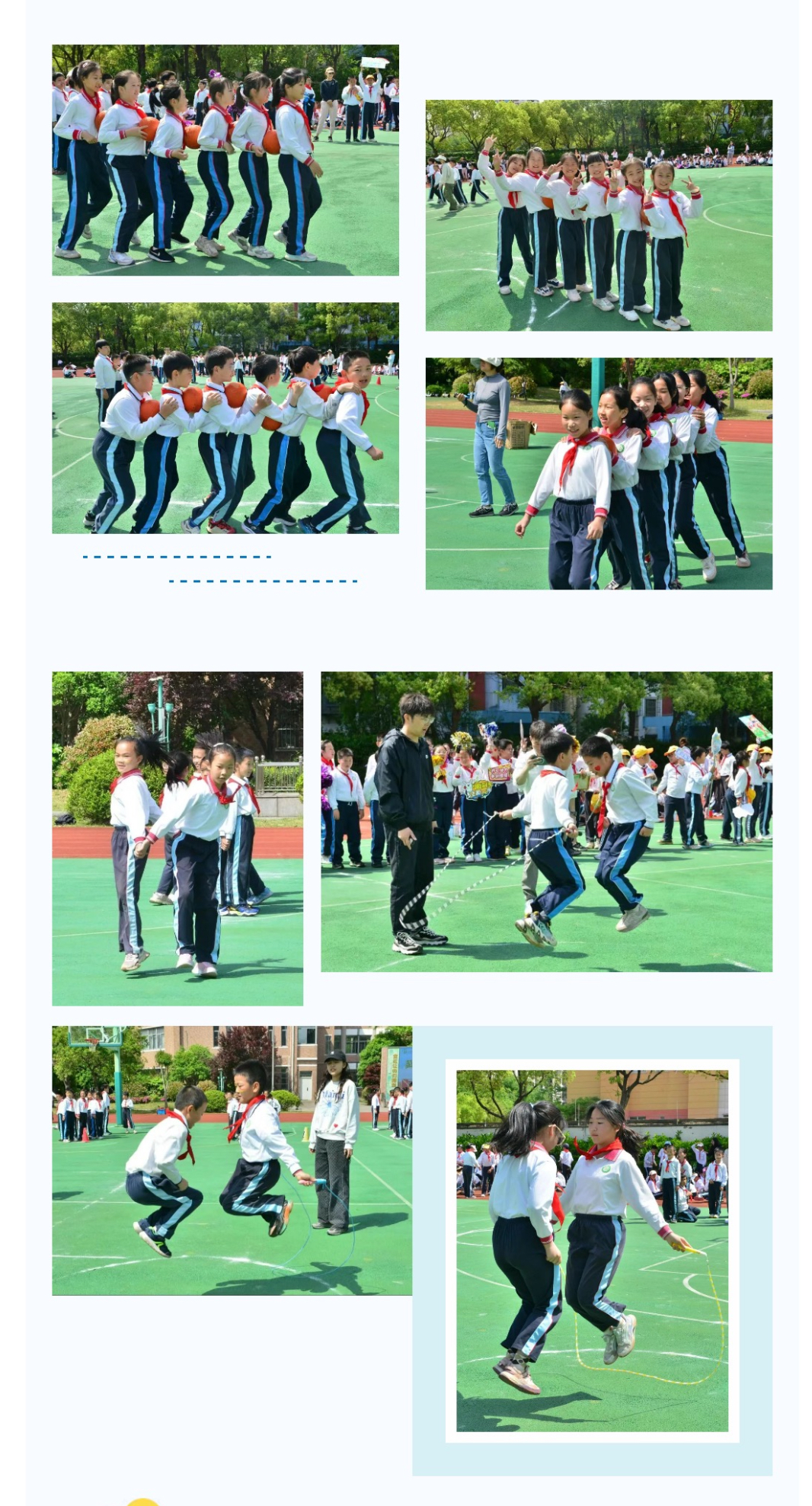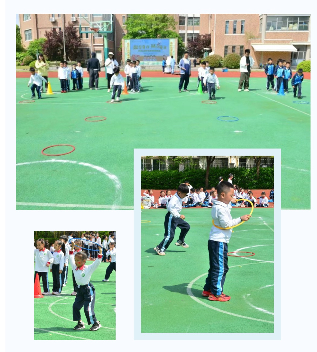 “灵蛇出洞”比赛中,低年级同学们化身“探险小勇士”,依次穿越体能圈,敏捷的动作和默契的接力引得全场欢呼。而在“灵蛇跃绳”中,小选手们手持跳绳,奋力跳跃,接力传递班级荣誉。每一步跳跃都充满童真与活力,展现了低年级学生的灵动与热情。