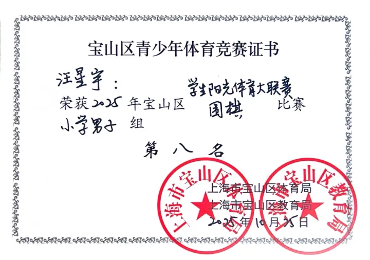 楚河汉界外,黑白论乾坤!2025年10月25日,宝山区学生阳光体育大联赛围棋项目热力开赛。乐业小学汪星宇、汤一凡、郑智诚三位围棋小将组成战队出征,在棋盘上沉着布局、巧思对弈,凭借扎实的棋艺与默契的配合斩获佳绩,展现出少年棋手的沉稳与智慧!