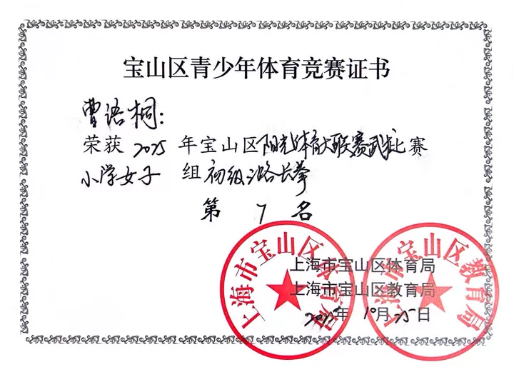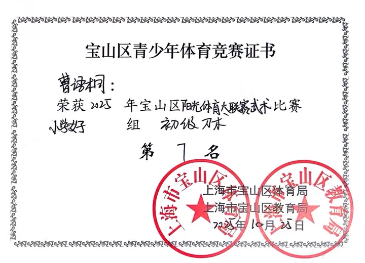 刚劲暗藏锋芒,招式尽显功底!2025年10月25日,宝山区阳光体育大联赛武术比赛在万众期待中拉开战幕。乐业小学的曹语桐同学身着飒爽武术服,怀揣满腔热忱与扎实功底出征,在两大项目的激烈角逐中沉着应战、奋力拼搏,最终斩获双项第七名的优异成绩,用一招一式诠释中华武术的魅力与少年不服输的劲头!