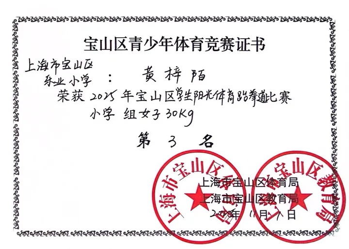 黄梓陌同学挑战小学女子组30公斤级赛事,在赛场上展现出超越年龄的沉稳。她精准判断对手节奏,巧妙化解攻势的同时果断出击,每一个动作都精准有力。经过多轮激烈角逐,最终凭借出色表现斩获第三名,为学校再添荣誉。