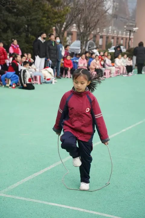 比赛中,小选手们个个精神抖擞,自备短绳准时集结在1米×1米的指定区域。随着裁判一声令下,绳子如银蛇穿梭,双脚似弹簧跳跃,“单脚交替跳”“双脚并跳”的标准动作轮番上演。即便偶尔出现绊绳,孩子们也迅速调整状态重新起跳,计时不停、拼搏不止的模样格外动人。1分钟的时间里,体育馆内跳绳击打地面的“哒哒”声、师生们的加油呐喊声交织在一起,成为校园里最热血的旋律。