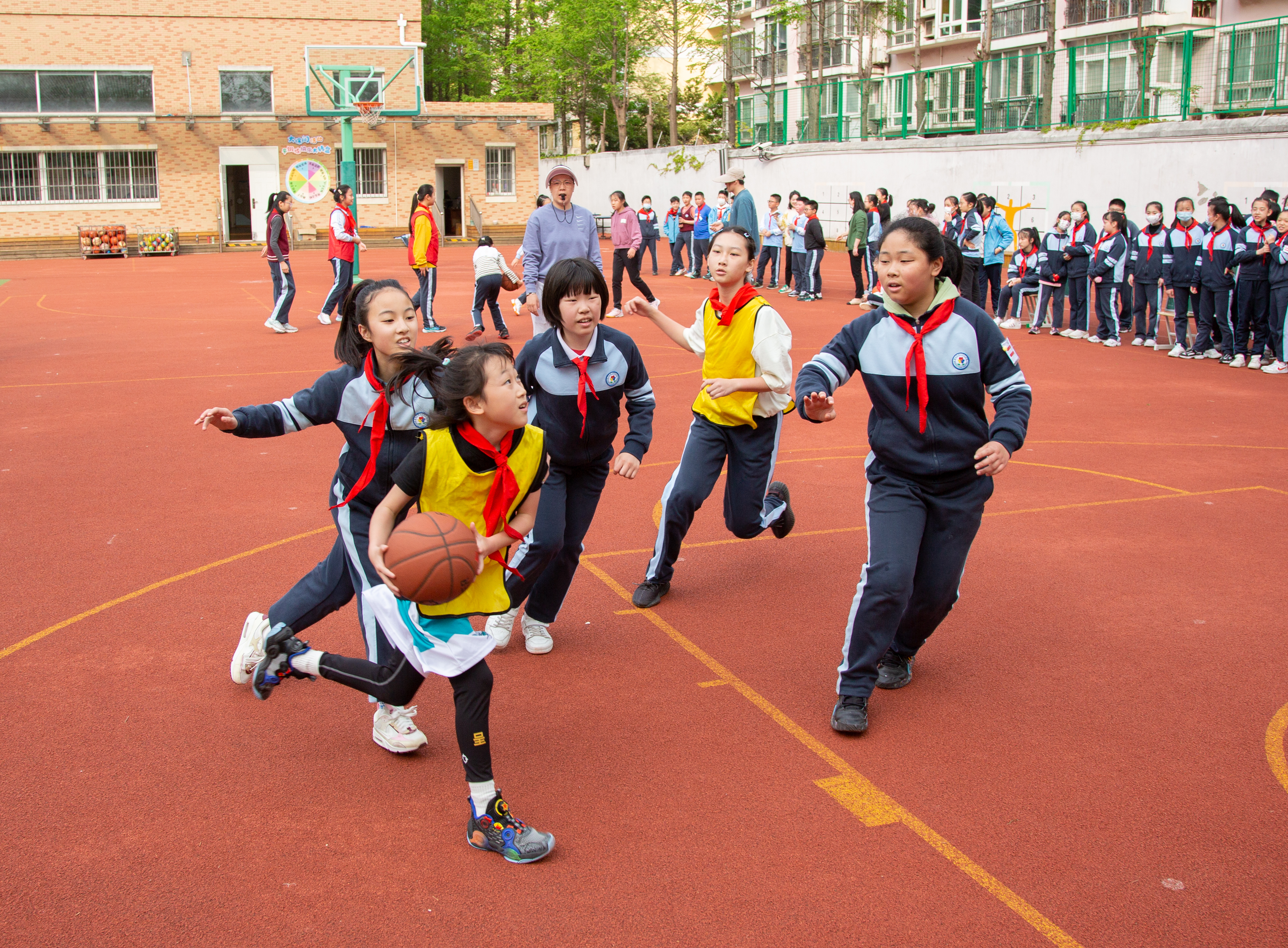 赛场上,球员们的每一次奔跑、跳跃、传球、投篮都充满力量;赛场边,师生们的助威声、呐喊声此起彼伏。班主任们举着 “加油” 手牌,跟着节奏挥舞;啦啦队的同学们穿着鲜艳的服装,跳起活力满满的舞蹈,为球队鼓劲;就连低年级的小观众也踮着脚尖,睁大眼睛紧盯赛场,不时为精彩进球拍手叫好。后勤小组的同学则忙着为球员递水、擦汗,用细致的服务保障赛事顺利进行,团结协作的暖流在校园里涌动。