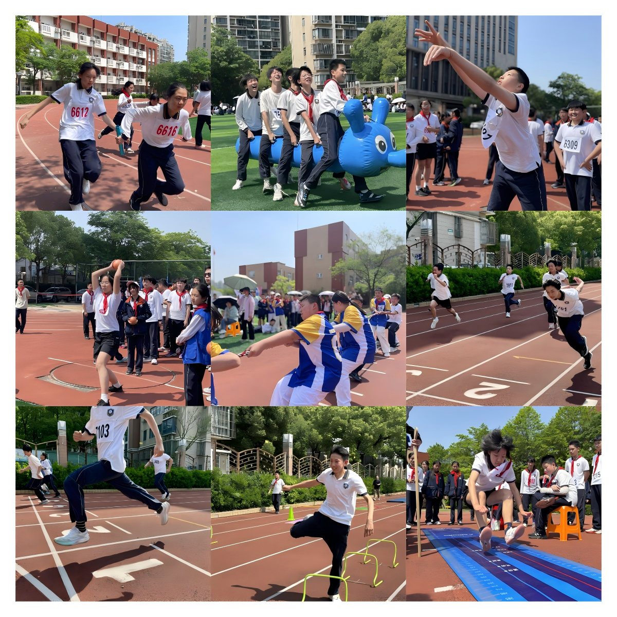 50米赛道上,选手们如离弦之箭,风驰电掣般冲向终点;立定跳远场地,同学们奋力一跃,在空中划出优美弧线;双手前掷实心球区域,力量与技巧完美结合;团体项目更是精彩,竞速毛毛虫比赛中,10男10女的队伍齐心协力,喊着口号向前冲;拔河比赛现场,8男8女组成的班级队伍紧握绳索,涨红了脸,为荣誉而战;障碍赛里,3男3女配合默契,跨越重重障碍,展现出坚韧不拔的精神。