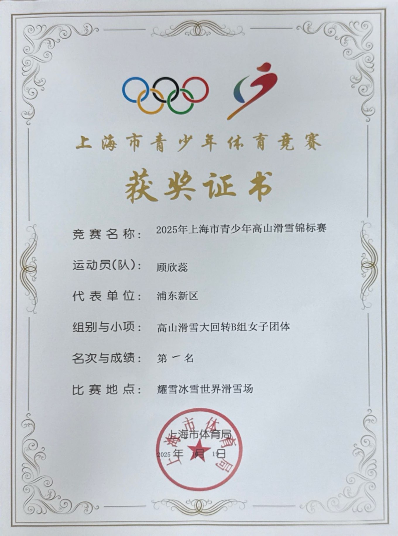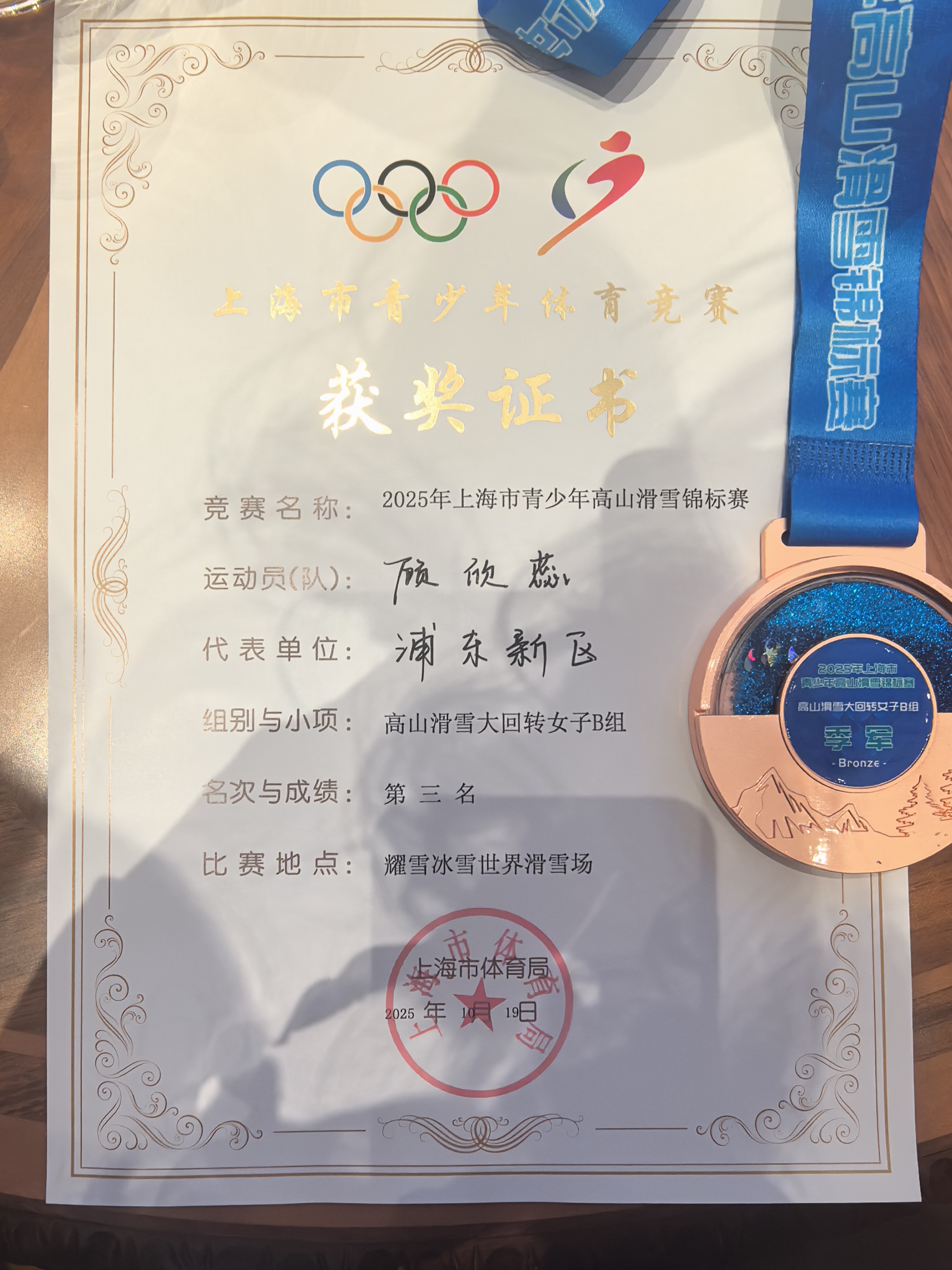 在10月的上海市青少年高山滑雪锦标赛中,顾欣蕊的表现更为亮眼:个人赛上,她参加“高山滑雪大回转女子B组”项目,获第三名;团体赛中,她与队友携手征战“高山滑雪大回转B组女子团体”项目,凭借团队的默契配合与出色发挥,成功斩获第一名,实现了“个人突破”与“团体夺冠”的双重收获,成为赛场上一道靓丽的风景线。