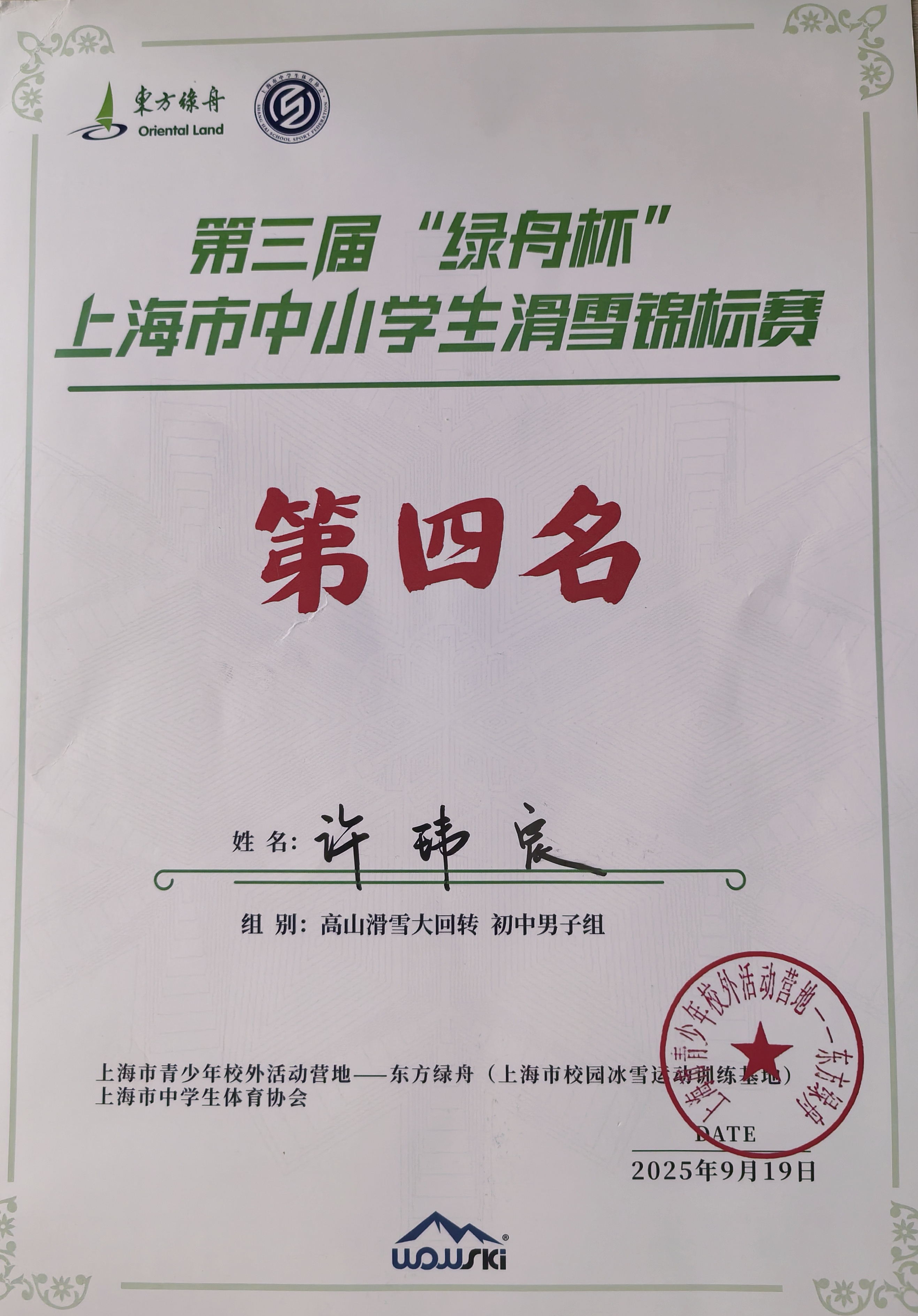 在9月举办的第三届“绿舟杯”上海市中小学生滑雪锦标赛、10月举办的上海市青少年高山滑雪锦标赛中,许玮宸面对全市优秀选手的挑战,他依旧保持稳定发挥,分别斩获“高山滑雪大回转初中男子组”和“高山滑雪大回转男子A组”第四名的好成绩,进一步印证了他在滑雪赛事中的竞争力。