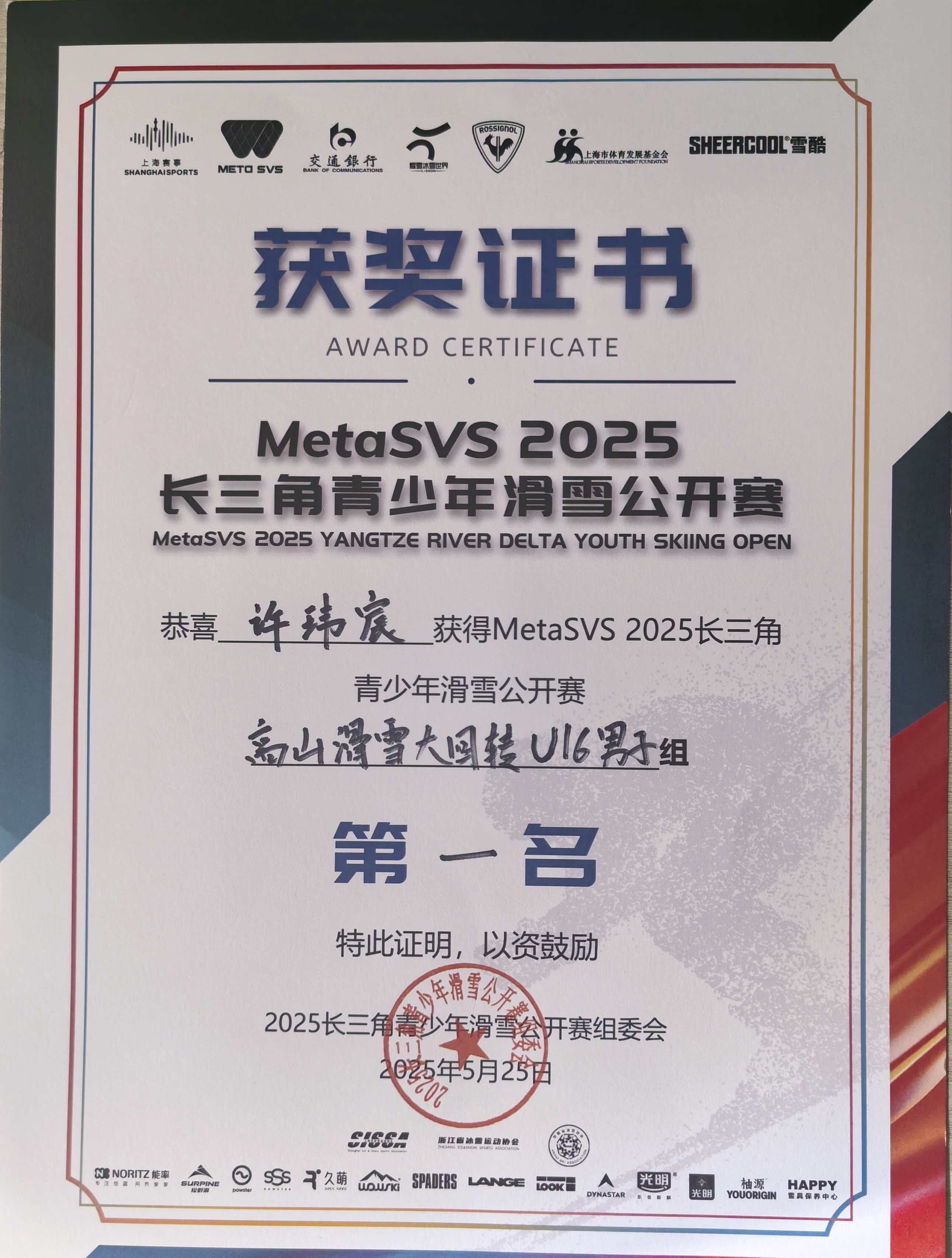 作为我校滑雪项目的佼佼者,许玮宸同学在2025年5月举办的MetaSVS 2025长三角青少年滑雪公开赛中,凭借出色的技术动作与强大的心理素质,在“高山滑雪大回转U16男子组”激烈角逐中脱颖而出,夺得冠军,站上了长三角地区青少年滑雪赛事的最高领奖台。