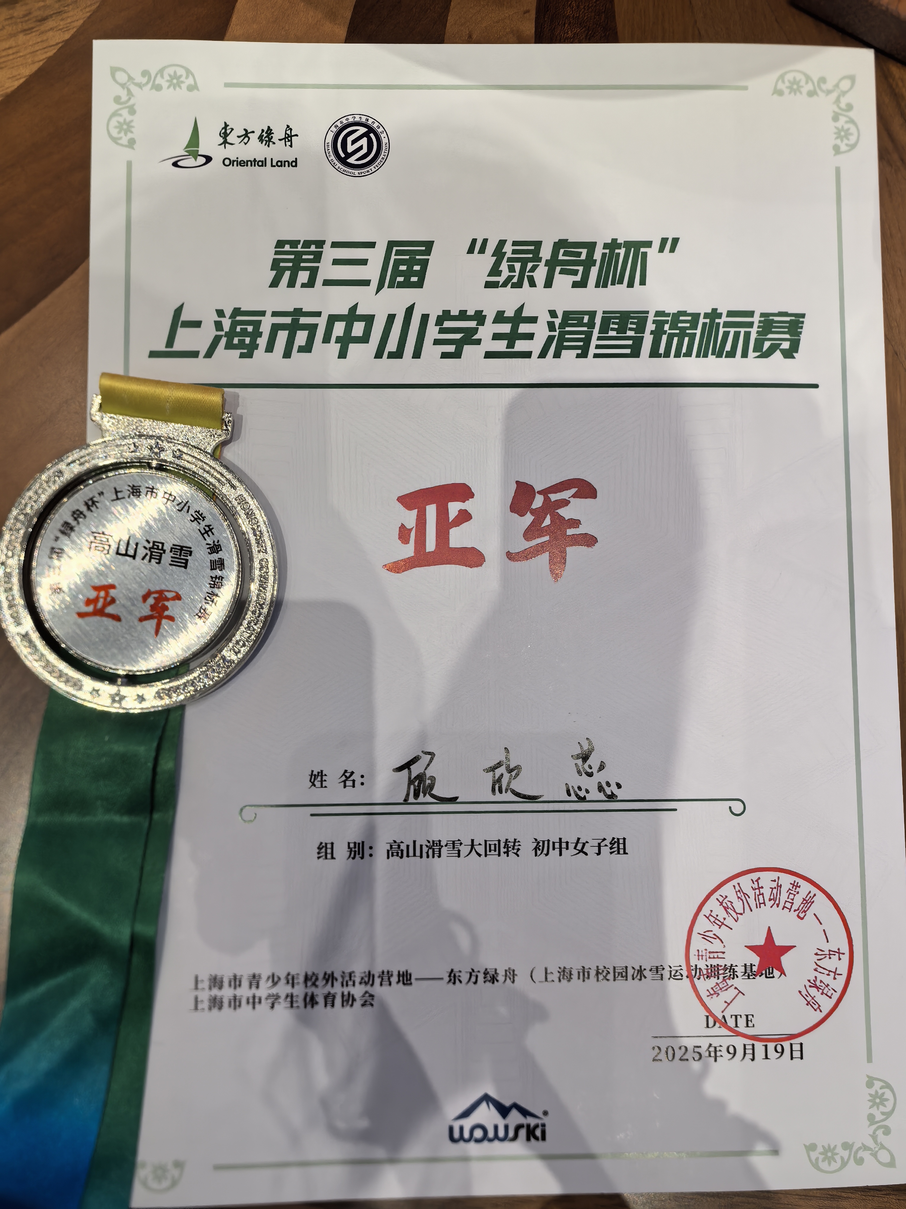 顾欣蕊同学在滑雪赛场上同样表现卓越,展现了少年运动员的活力与潜力。在2025年9月的第三届“绿舟杯”上海市中小学生滑雪锦标赛中,她参加“高山滑雪大回转 初中女子组”比赛,凭借流畅的转弯、精准的节奏控制,最终夺得亚军。