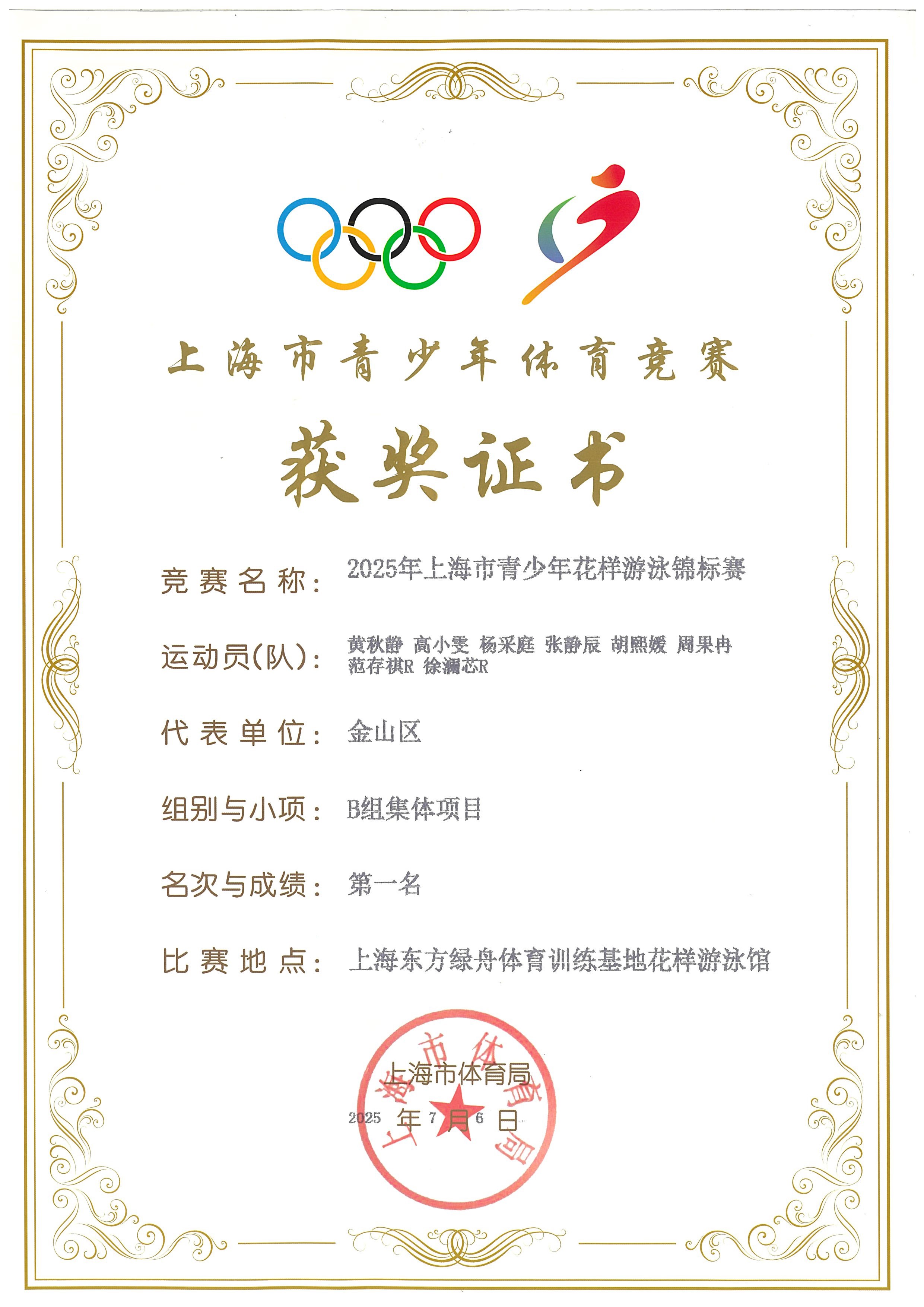 在2025年7月上海市青少年花样游泳锦标赛中,高小雯同学与队友默契协作,双线作战均取得优异成绩:在“B组集体项目”中勇夺第一名,又在“AB组自由组合”项目中再添一枚冠军奖牌。这两项市级冠军的荣誉,充分彰显了她在技术与表现力方面的非凡实力。