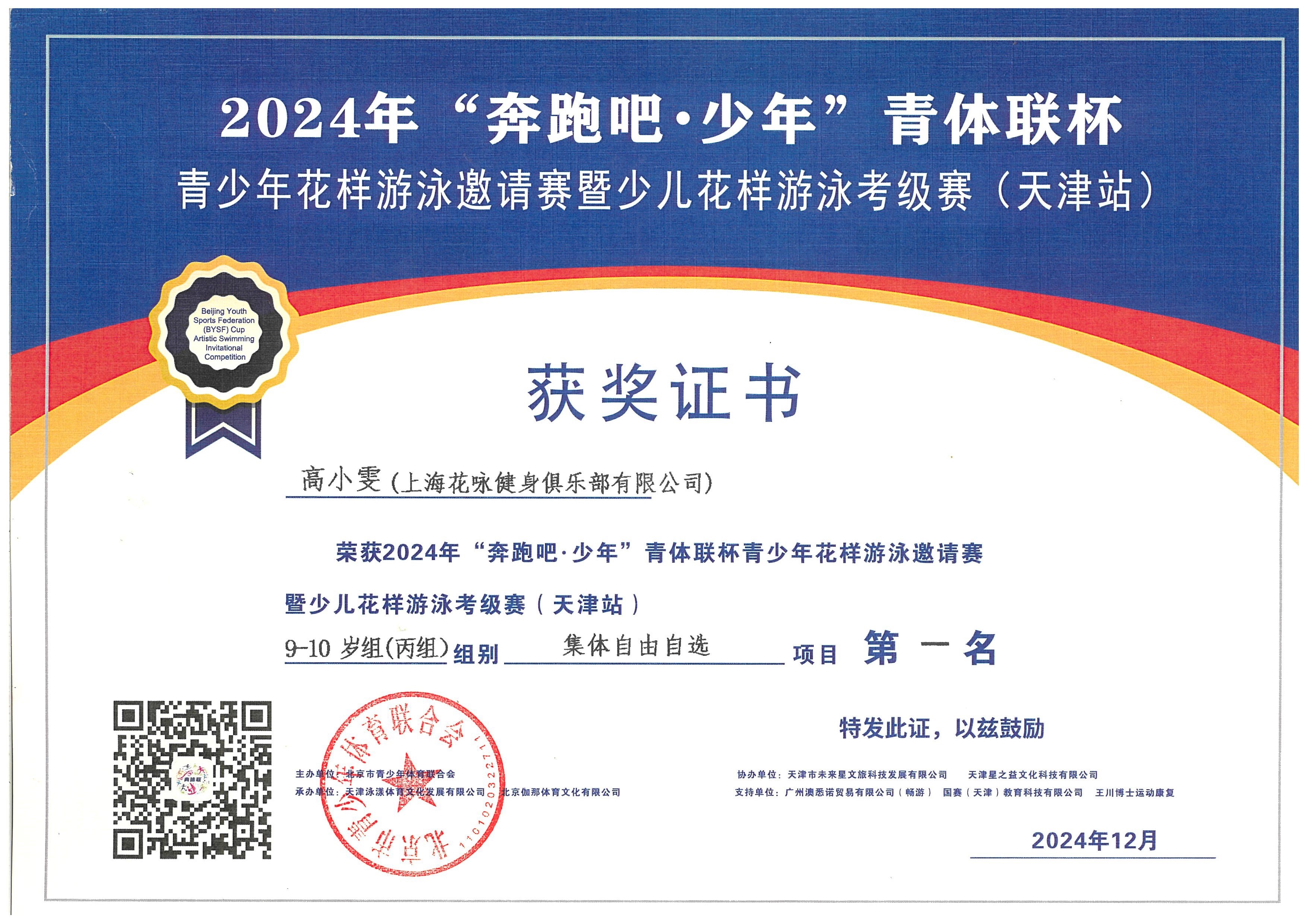 更令人自豪的是,她还在跨省市、全国赛场上崭露头角。在2024年“奔跑吧・少年”青体联杯青少年花样游泳邀请赛暨少儿花样游泳考级赛(天津站)上,她在“9-10岁丙组集体自由自选项目”中助力团队拿下第一名,首次在跨省市赛事中捧起冠军奖杯;在2025年全国U系列花样游泳比赛中,她参与了“儿童级组合”项目,并最终荣获第九名,将杨泰学子的卓越风采展现于全国舞台。