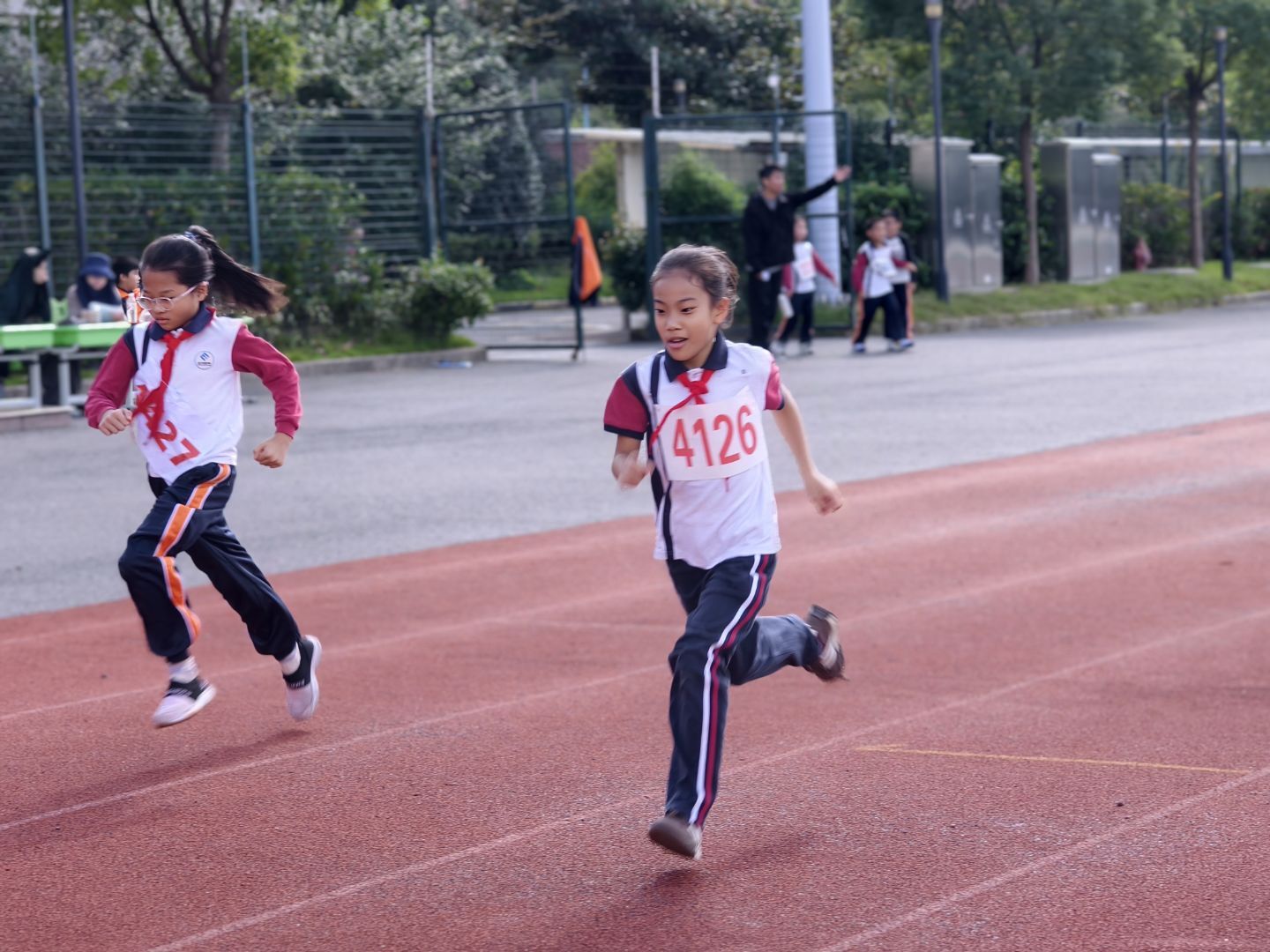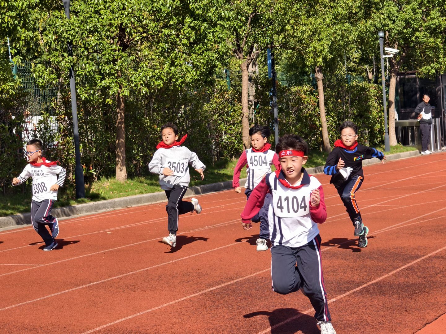 50米/100米:小运动员们眼神专注,像离弦之箭般冲向终点,跑道旁同学们的加油声此起彼伏。
