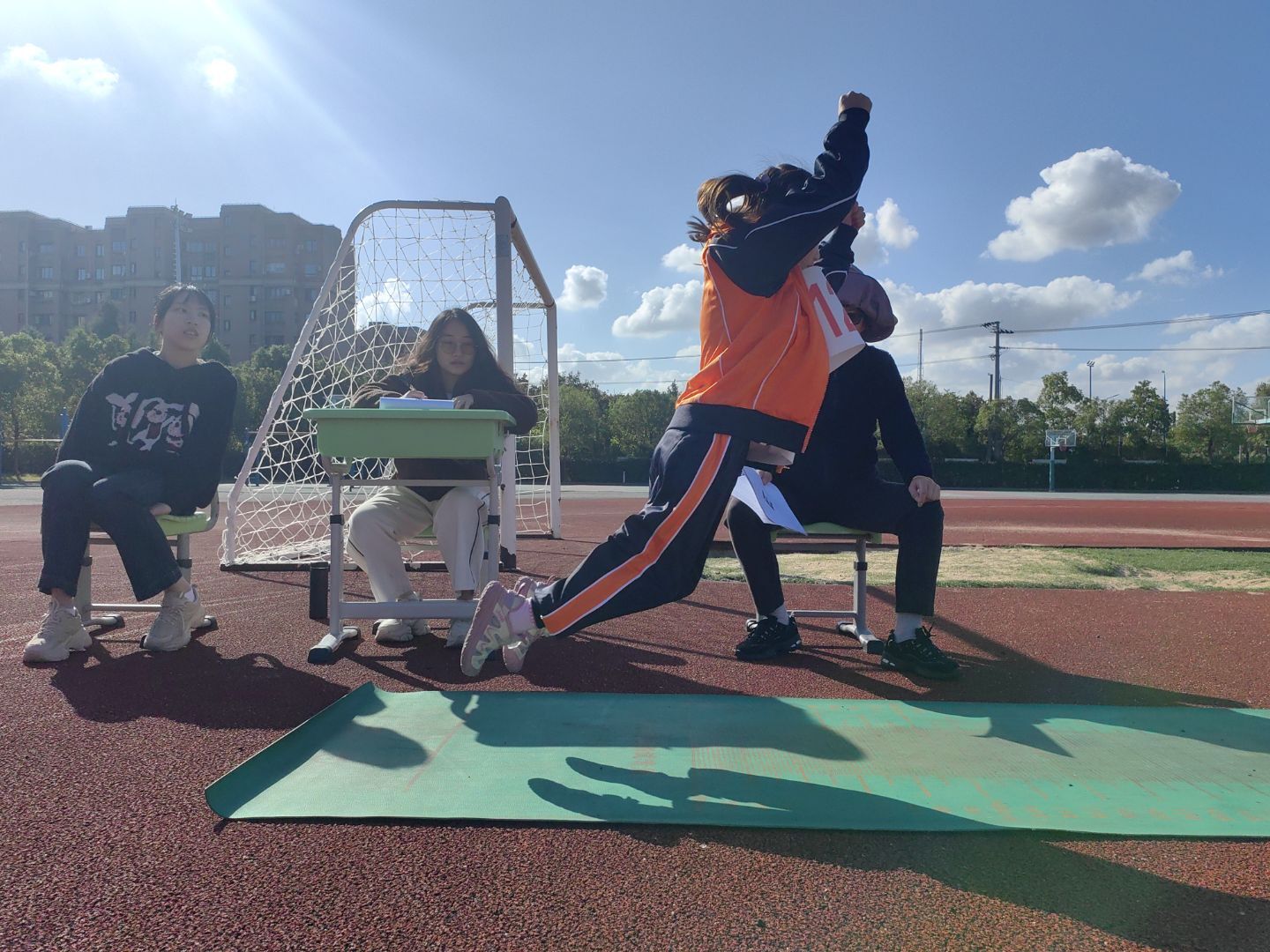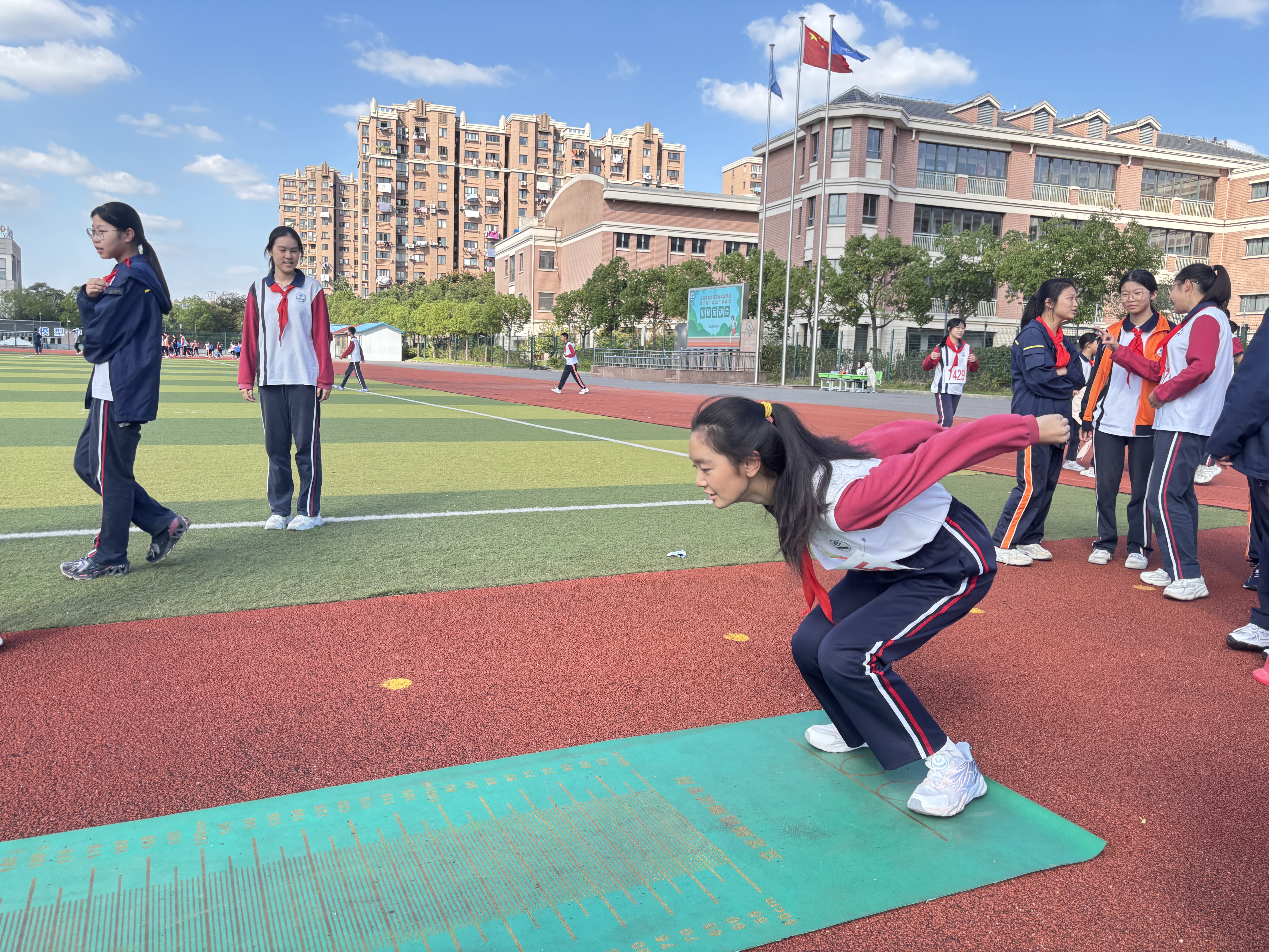 立定跳远:初中学子们纵身一跃,身姿更为舒展,力求在更远的地方落地。