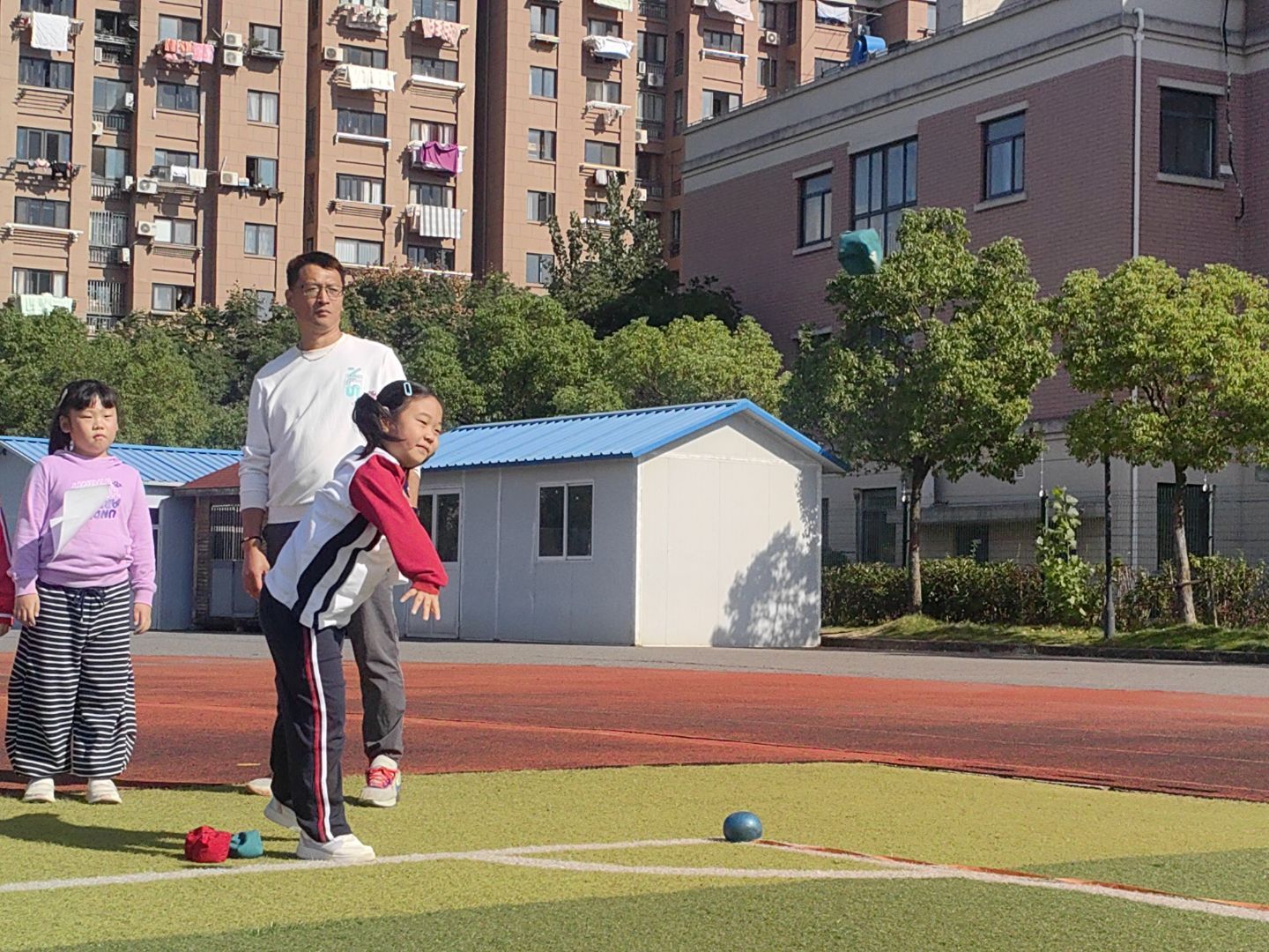 掷沙包/实心球:一道道优美的抛物线划过天空,沙包与实心球承载着孩子们的力量与梦想飞向远方。