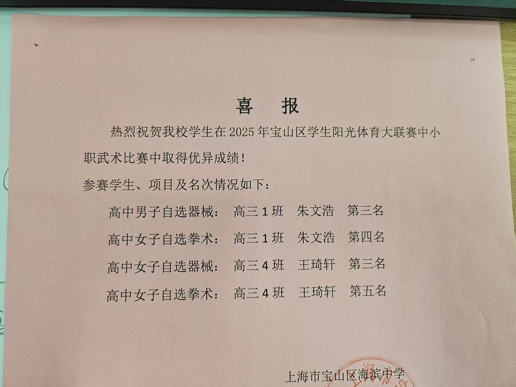 近日,2025 年上海市宝山区高中武术比赛在区青少年活动中心体育馆圆满落幕。作为宝山区校园中华传统武术文化的传承者与推广者,上海市宝山区海滨中学组建了一支功底扎实的参赛队伍,学子们在拳术、器械等多个项目中尽显风采,凭借规范的招式动作、饱满的精神风貌与稳定的临场发挥,在全区激烈角逐中脱颖而出,斩获多项个人与团体荣誉,充分展现了海滨中学学子对传统武术的热爱与卓越的综合素养。