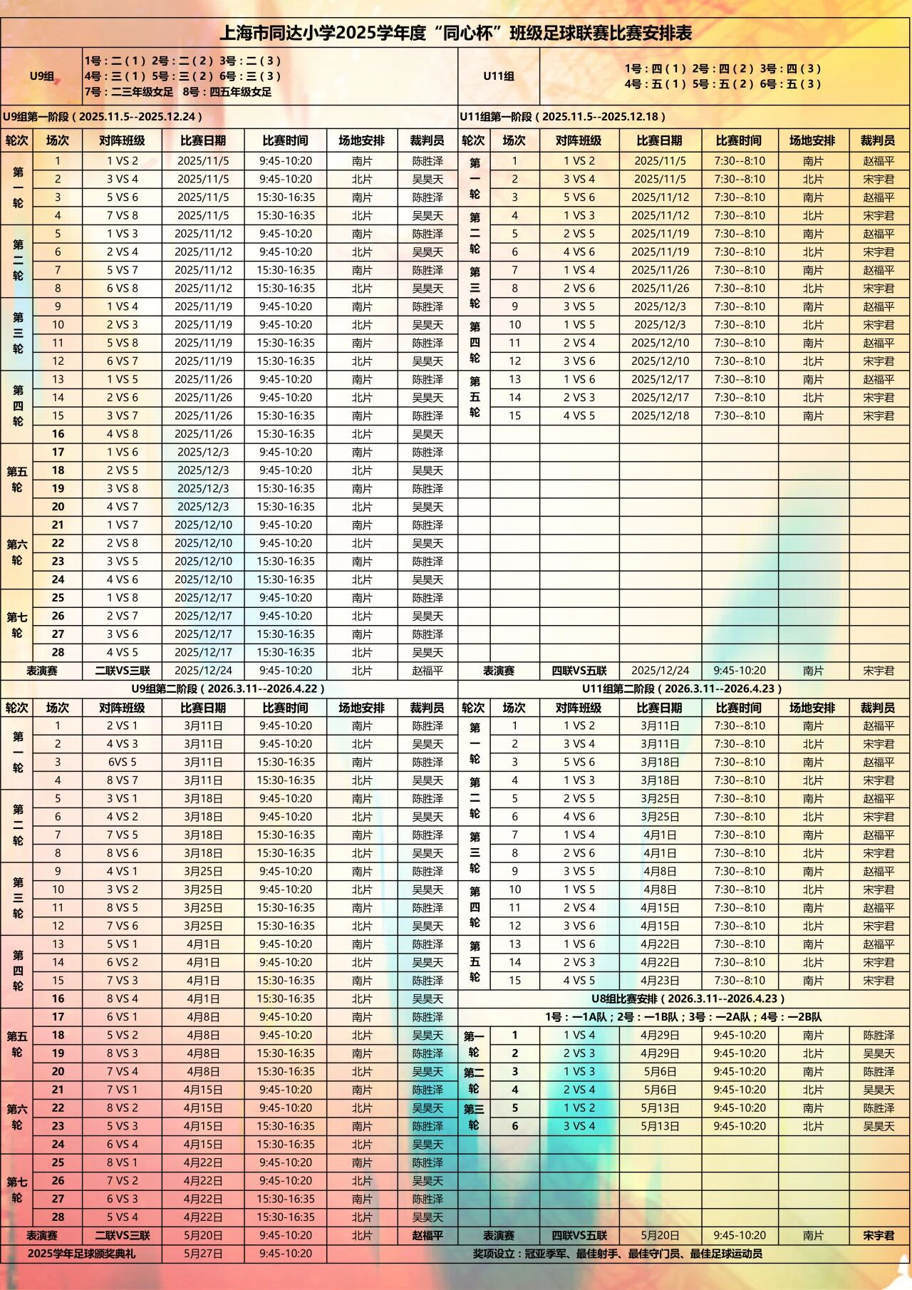 本学年,我校足球赛事全面升级为班级足球超级联赛!赛事分为U11(四五年级) 和U9(二三年级及U9、U11女子足球队),更多班级、更多队员将在联赛的舞台上挥洒汗水,追逐梦想。