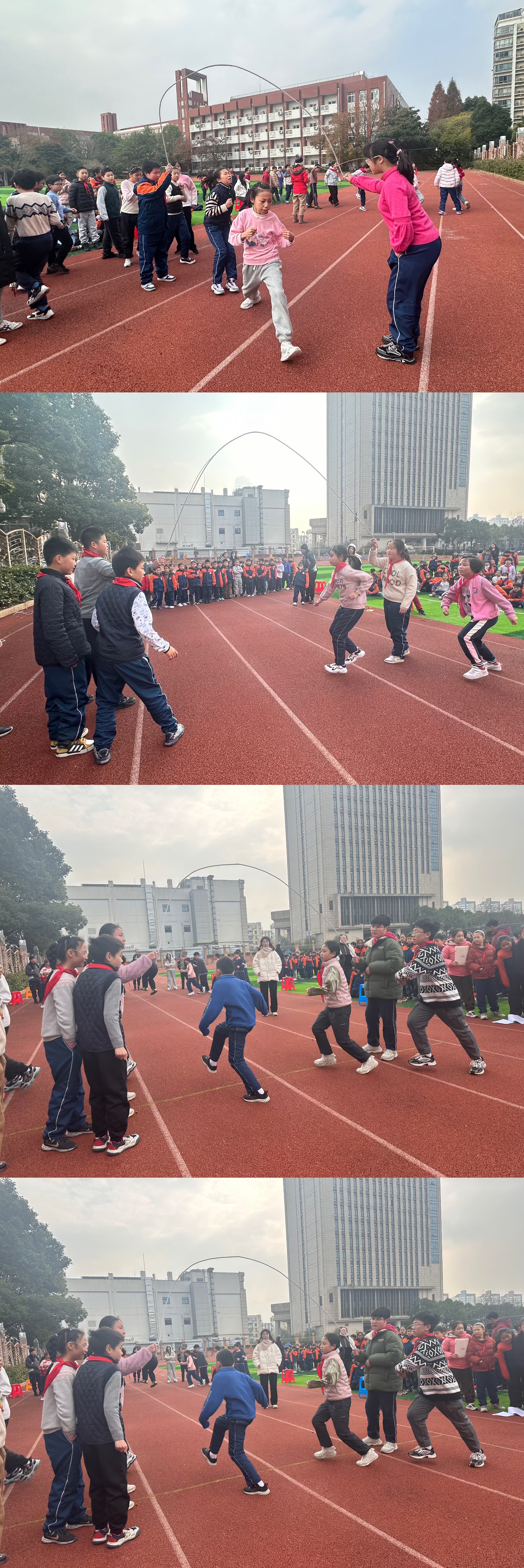 最激动人心的八字长绳压轴而至。比赛场地已被人群围得水泄不通。摇绳手们迅速进入状态,灵巧地挥动着绳子,长绳在其手中仿若蛟龙,声音清脆而有节奏;跳绳者如敏捷飞燕,精准跃入绳中,鱼贯而入。长绳在空中划过优美弧线,从高空俯瞰,恰似灵动“8”字。班主任们也化身啦啦队,呐喊助威声响彻云霄。