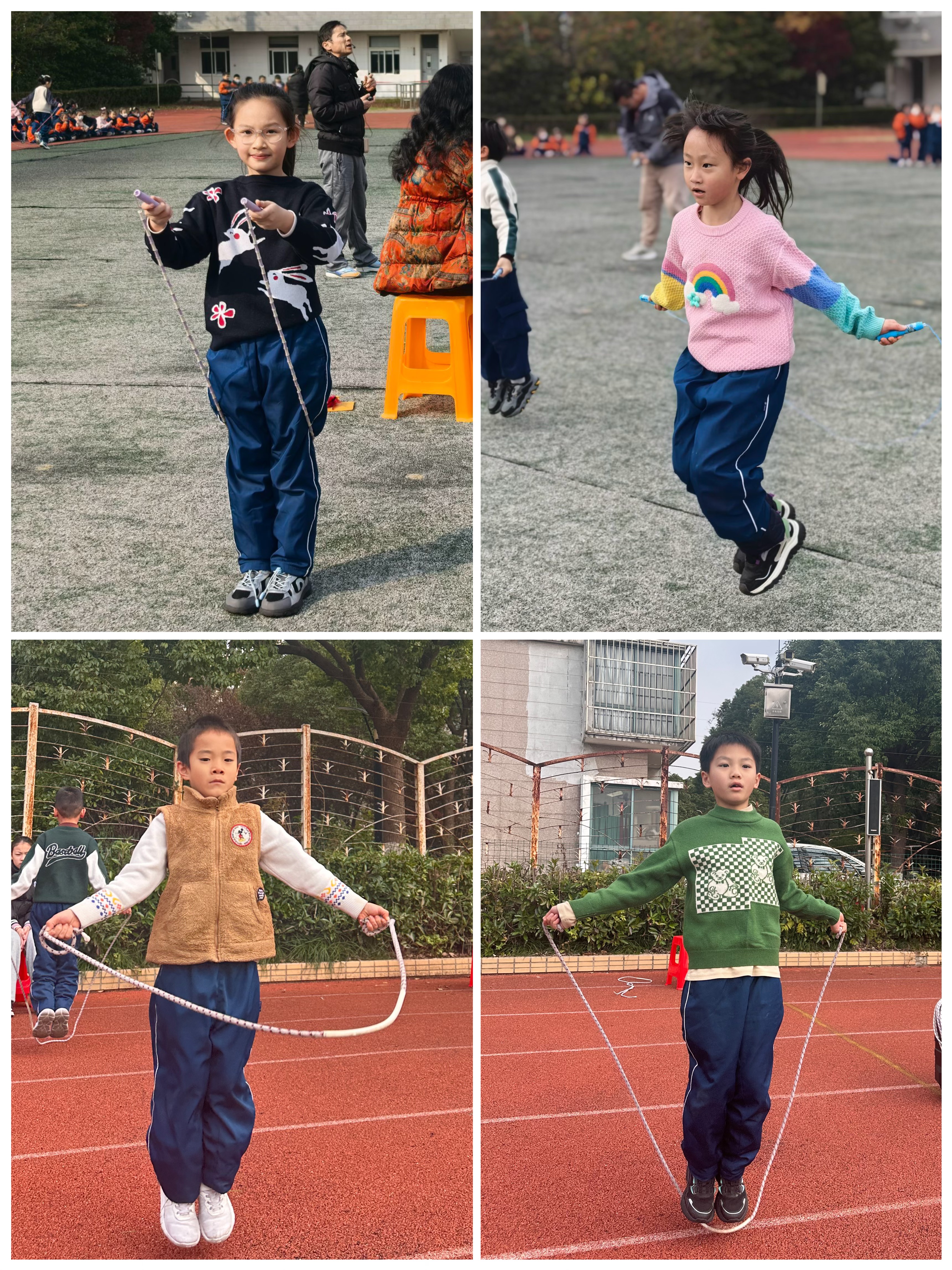 单人一分钟短绳率先开场。赛前,选手们摩拳擦掌,跃跃欲试。哨声乍响,跳绳如银蛇飞舞,“呼呼”声与同学们的呐喊交织。时间飞逝,比赛转瞬即逝,却让人热血沸腾,意犹未尽。