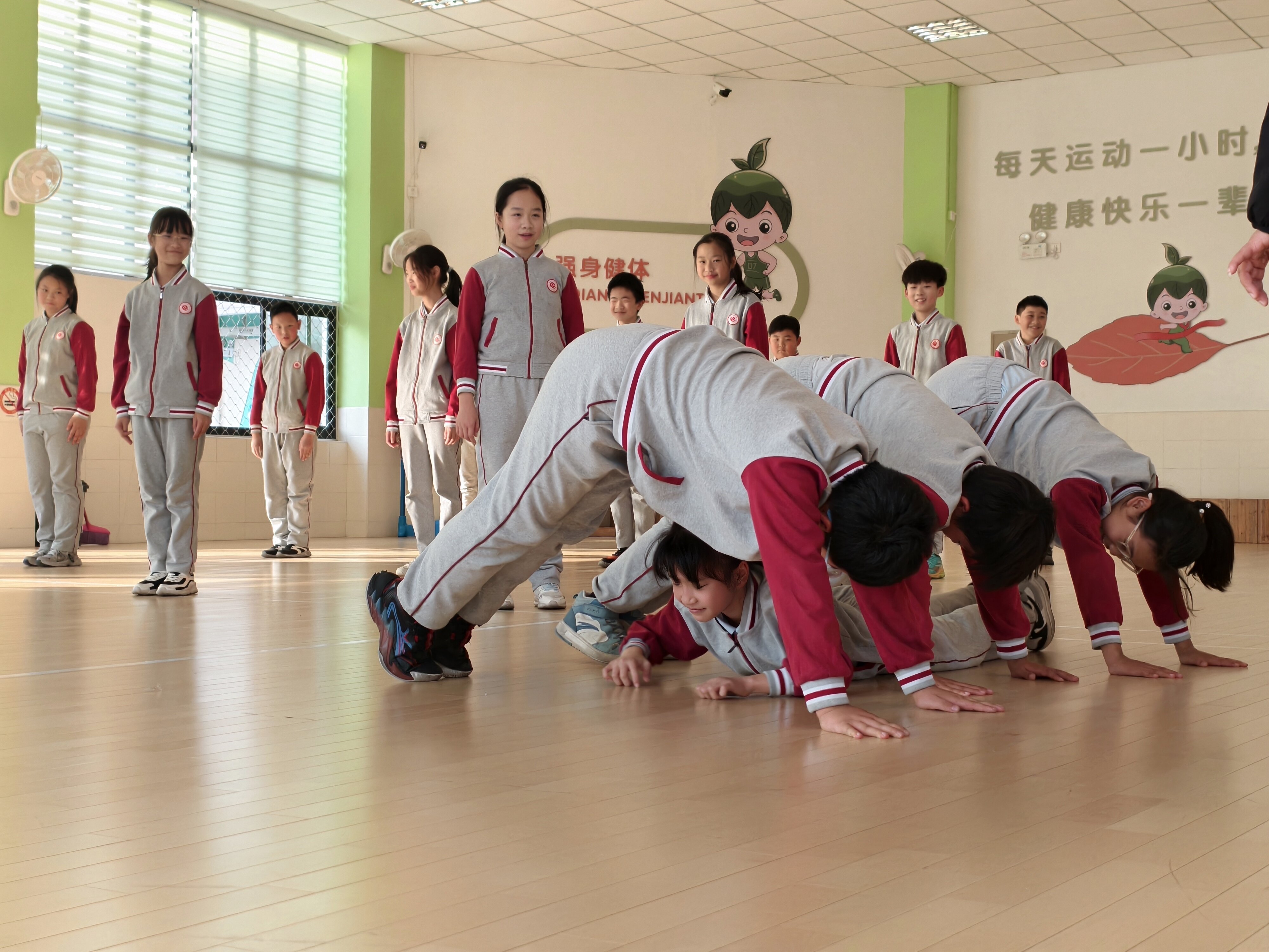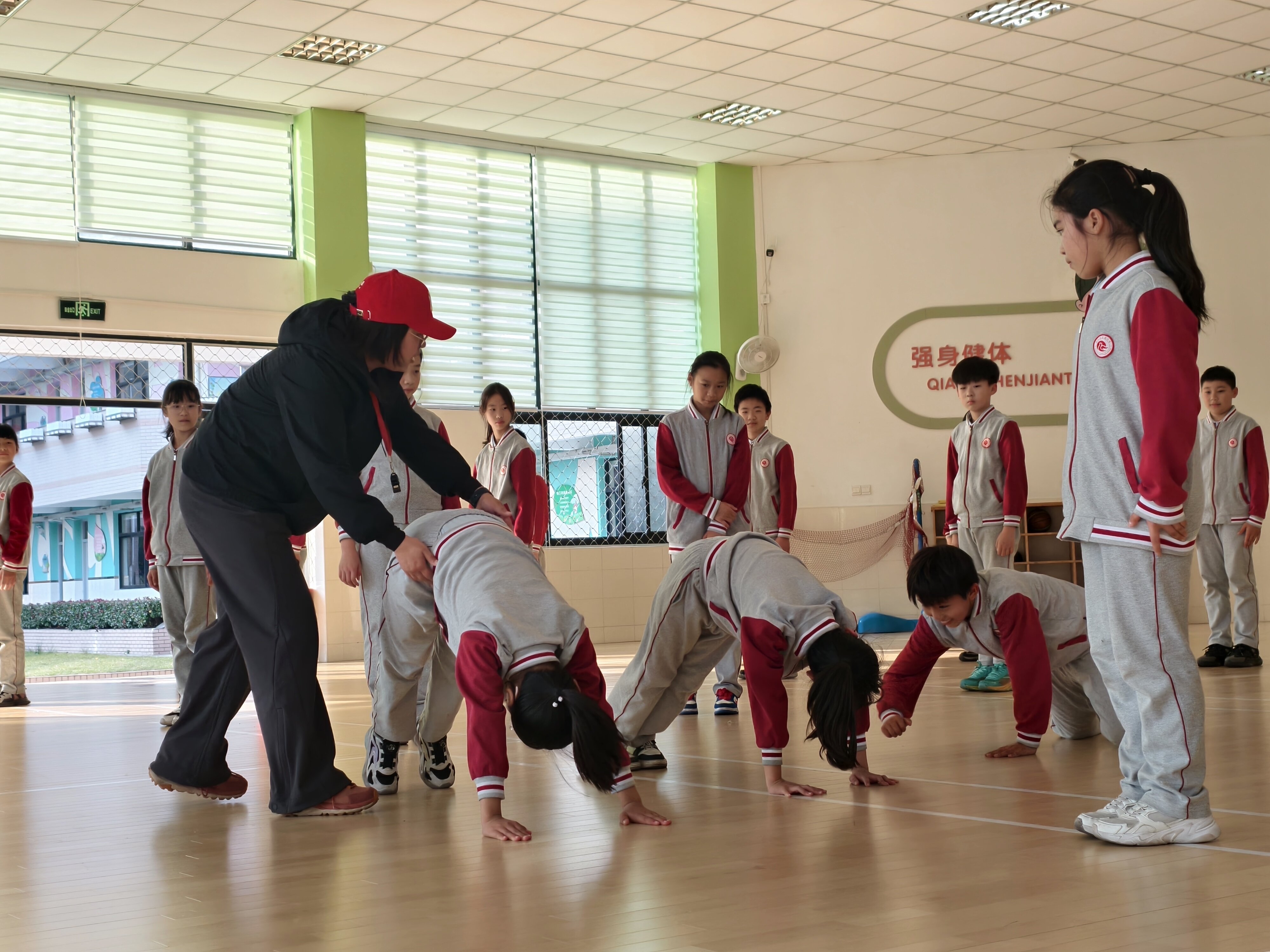 教学中,潘老师巧思频出:以“地上支撑”、“隧道通行”、“搭桥过海”、“压路机”等趣味游戏串联技能训练,让原本枯燥的力量与协调练习变得生动有趣,有效解决了部分学生上肢力量弱、协调性欠佳的问题;通过“单人练习—双人协作—团队竞赛”的递进式流程,既给足学生自主探索空间,又以分层任务满足不同运动能力学生的需求,让每个孩子都能在练习中获得成功体验,逐步建立体育学习自信心。
