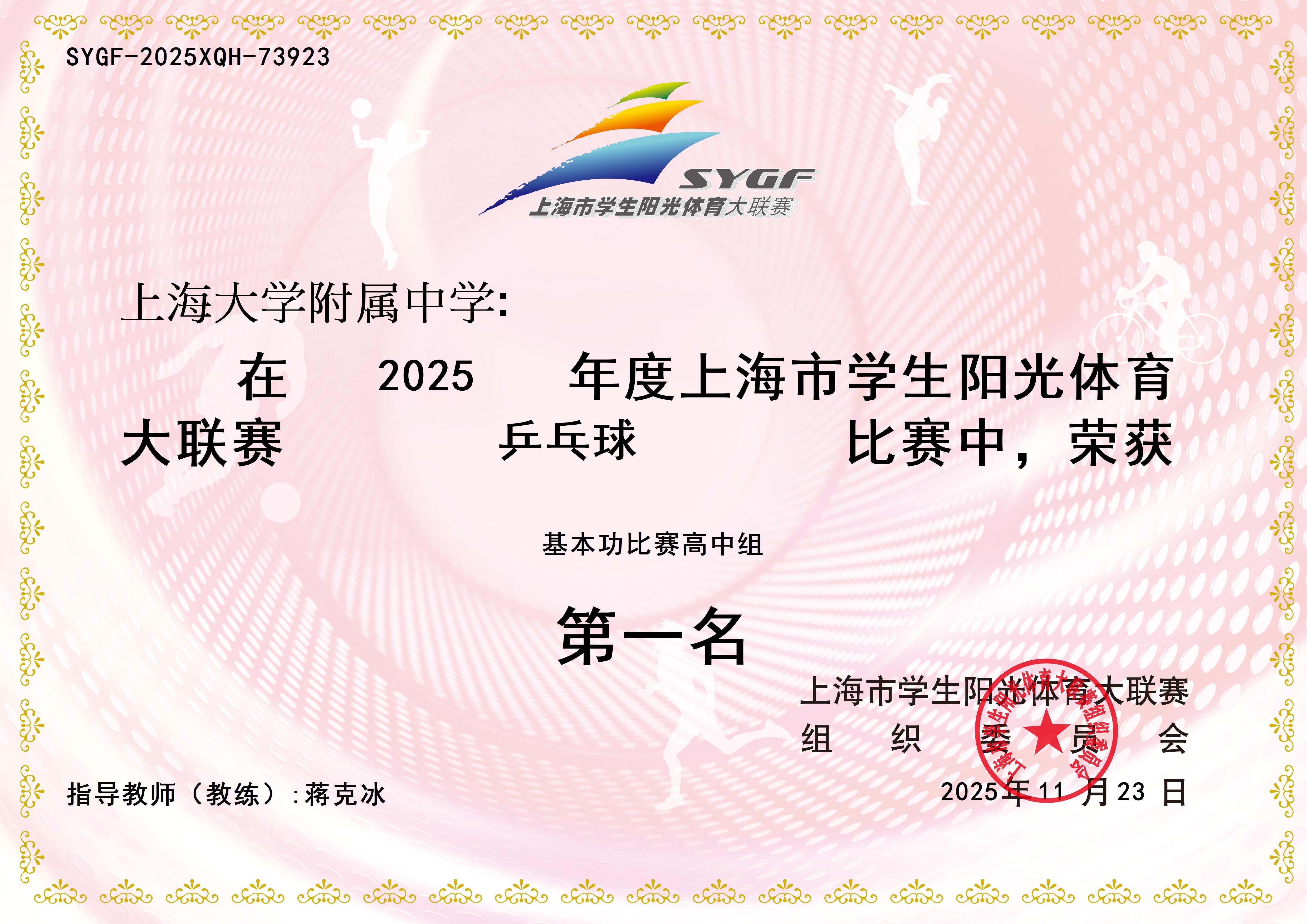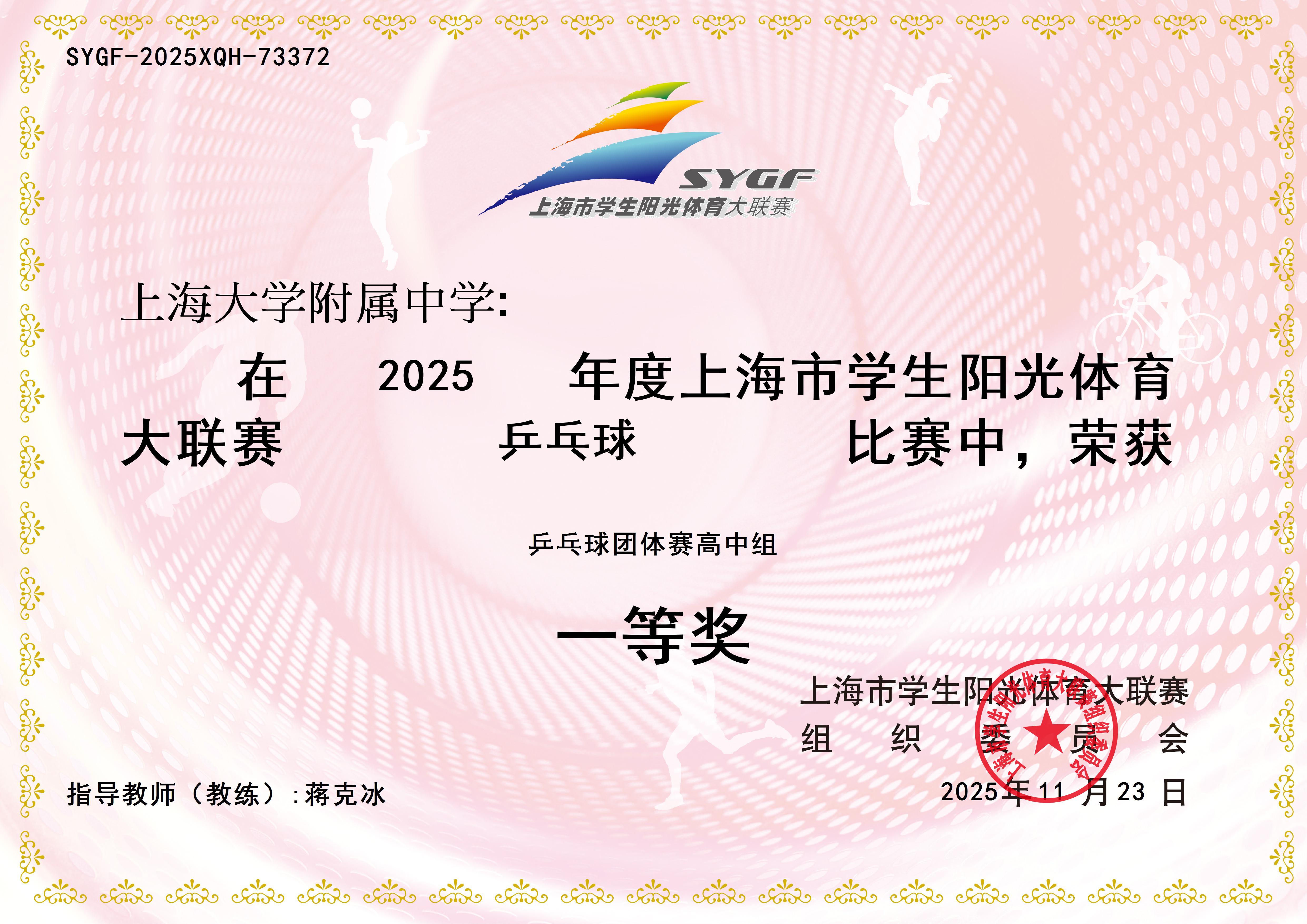 在蒋克冰、赵岩两位教练的专业指导下,上海大学附属中学乒乓球队在2025年上海市阳光体育大联赛中表现出色,荣获团体赛一等奖和基本功赛(循环推挡)第一名两项重要奖项。