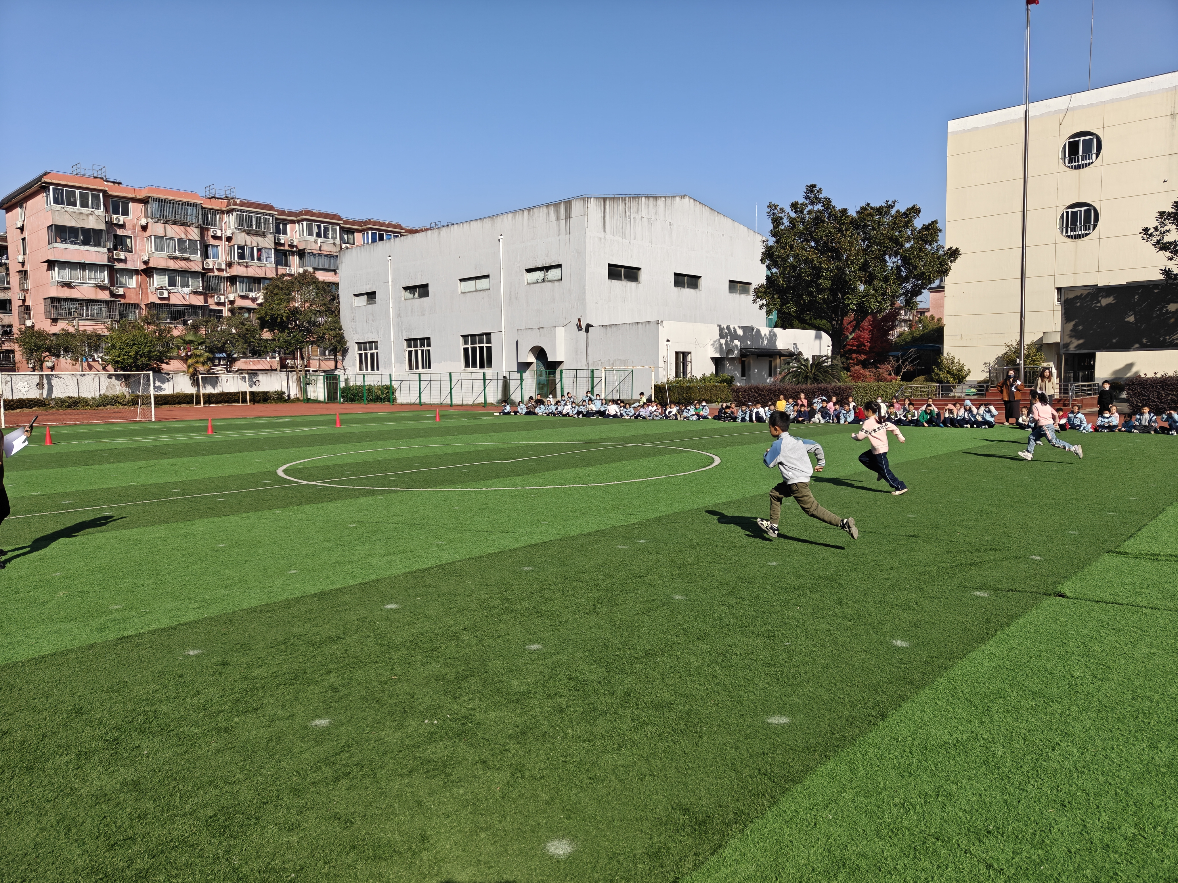 参赛学生们迎着阳光全力奔跑,在赛道上完成折返、绕桩等体能挑战,矫健的身影成为绿茵场上一道亮眼的风景线。场边的同学组成啦啦队,坐在草坪边为参赛伙伴呐喊助威,欢呼声、加油声此起彼伏,将比赛的欢乐氛围推向高潮。老师们则在赛场边细心引导、保障安全,确保比赛有序进行。