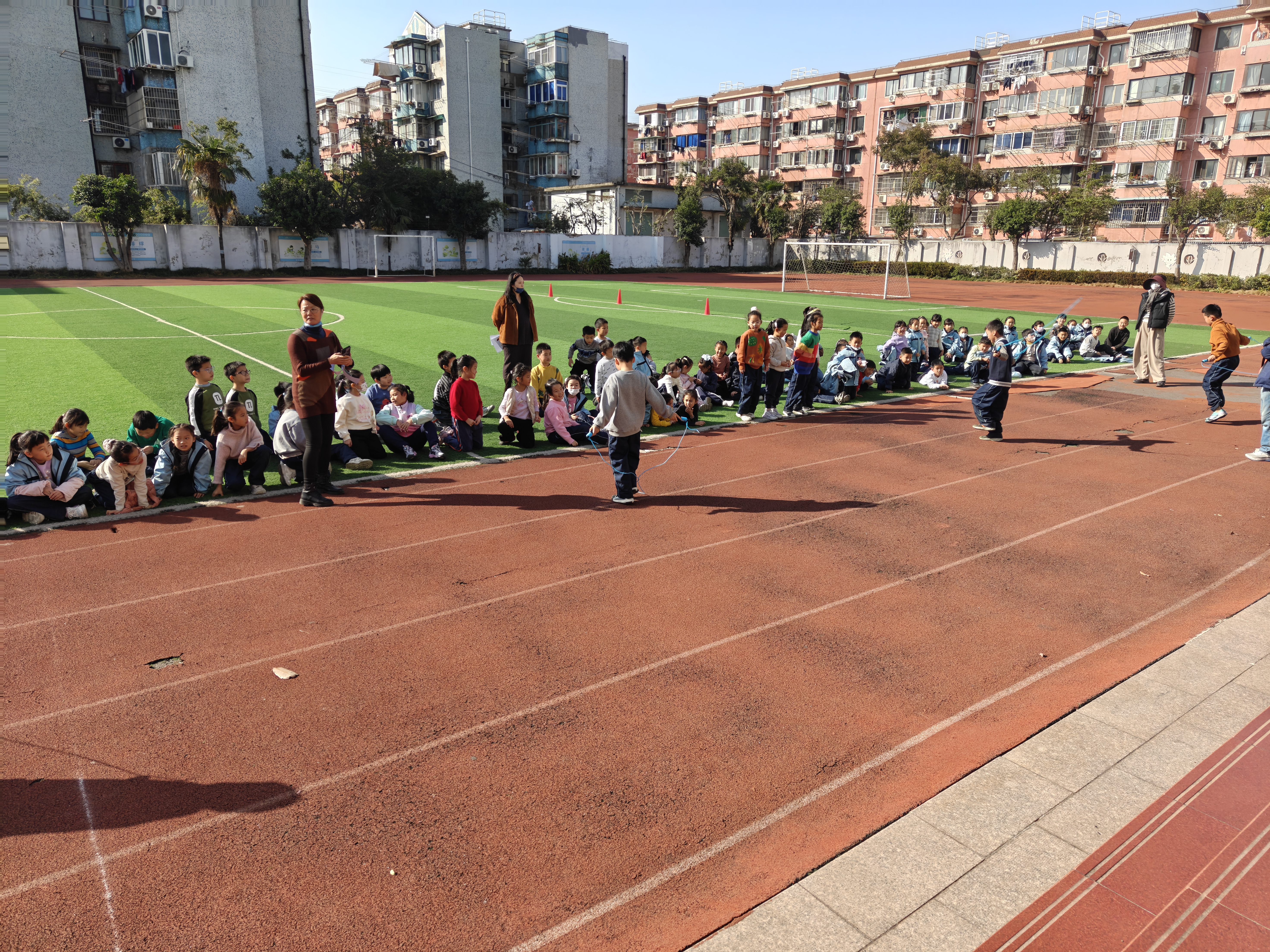 比赛现场,参赛的孩子们精神抖擞,在跑道上紧握跳绳跃动,绳子在脚下快速翻飞,展现出灵动的身姿。场边的小观众们围坐成排,目光紧紧追随着赛场,不时为同伴的精彩表现欢呼鼓掌,老师们则在一旁细心组织、加油鼓劲,整个操场洋溢着欢声笑语与竞技活力。