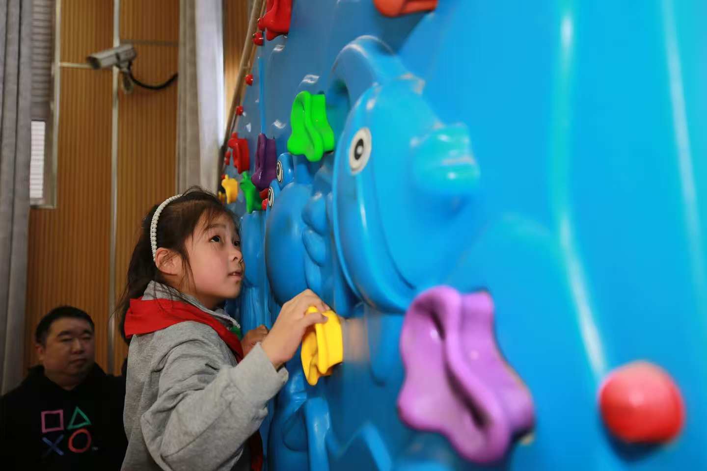 西部校区的雏鹰广场上,“车轮滚滚” 项目中七名同学同步迈步、协同向前,彩色的 “车轮” 在阳光下滚动出团结的轨迹;“竹竿舞”现场,孩子们跟着节奏跳跃穿梭,清脆的竹竿敲击声与欢声笑语交织成趣。篮球场与沙坑旁,投篮、投掷实心球等项目让孩子们在规范动作中提升体能;门厅内的高尔夫、保龄球项目则考验着大家的精准度与专注力,每一次成功击球都引来阵阵欢呼。风雨操场的挑战赛专区更是精彩不断,一分钟踢毽、四人仰卧起坐、攀岩等项目,让孩子们在挑战自我中突破极限,展现出顽强的毅力。