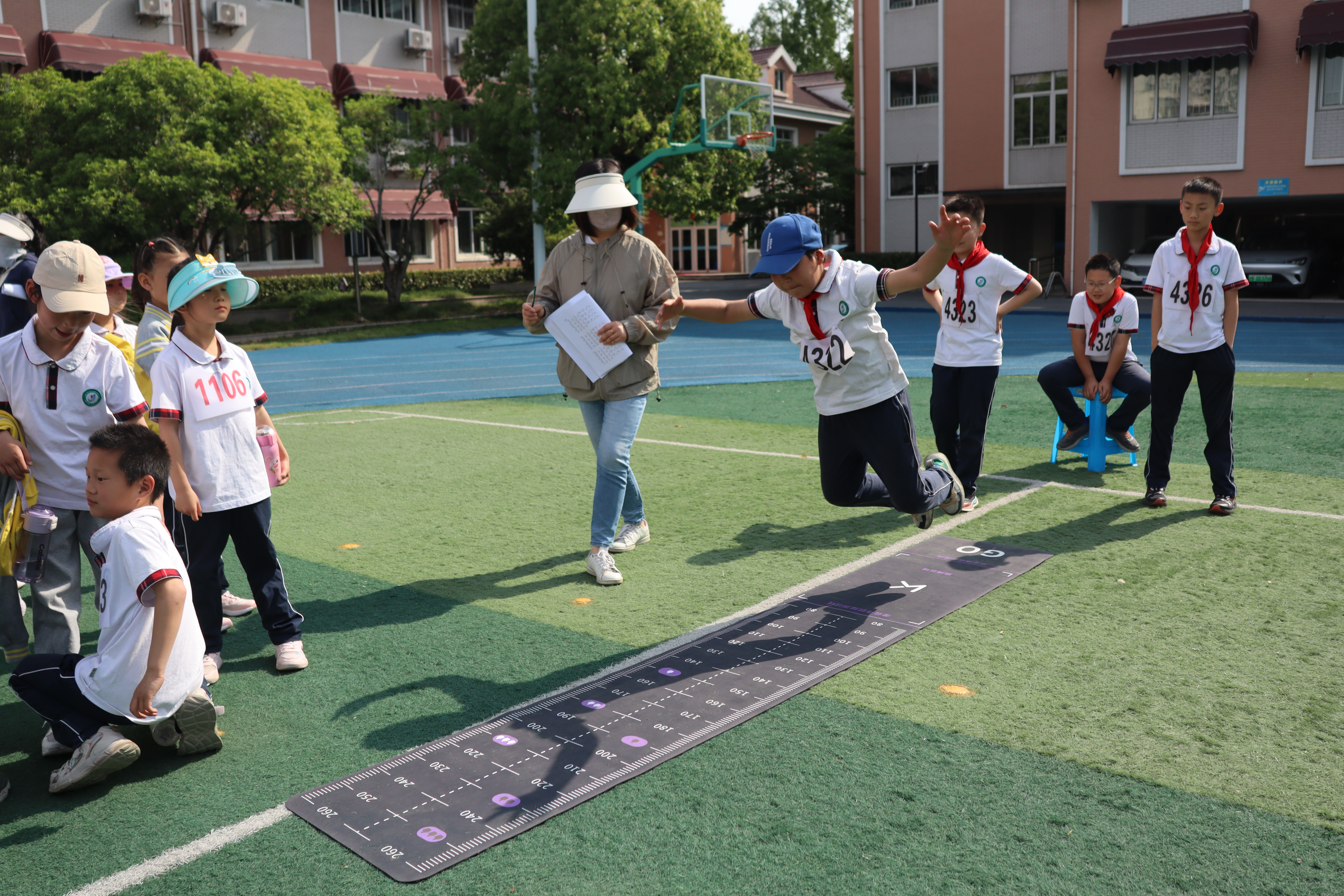 田赛场上,学童们同样展现出精湛的竞技水准。立定跳远时,他们屈膝蓄力、腾空一跃,在空中划出优美弧线;实心球投掷中,弓背、转体、挥臂,每个动作都经过反复打磨……选手们专注的眼神、标准的动作,彰显着平日训练的扎实功底和对胜利的执着追求。