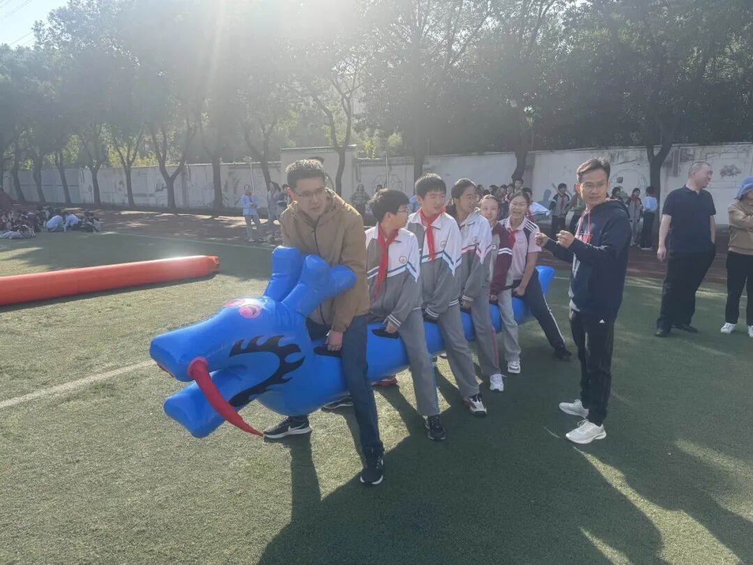 紧接着的“趣味毛毛虫”竞赛将现场气氛推向高潮。六人一组的同学们骑在色彩鲜艳的充气毛毛虫上,齐心协力、步调一致地向前冲刺。尤为暖心的是,陈校长和班主任老师们纷纷加入学生队伍,与同学们并肩参赛。师生同场竞技、笑语不断,现场洋溢着融洽温馨的校园氛围。